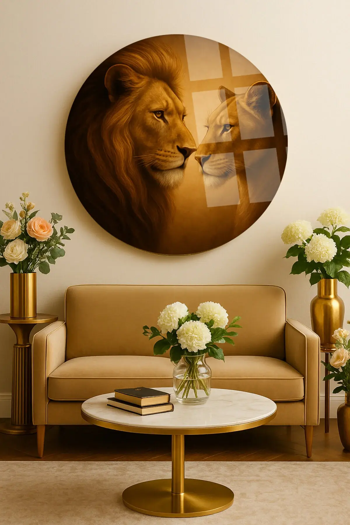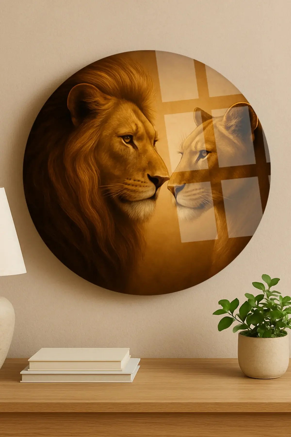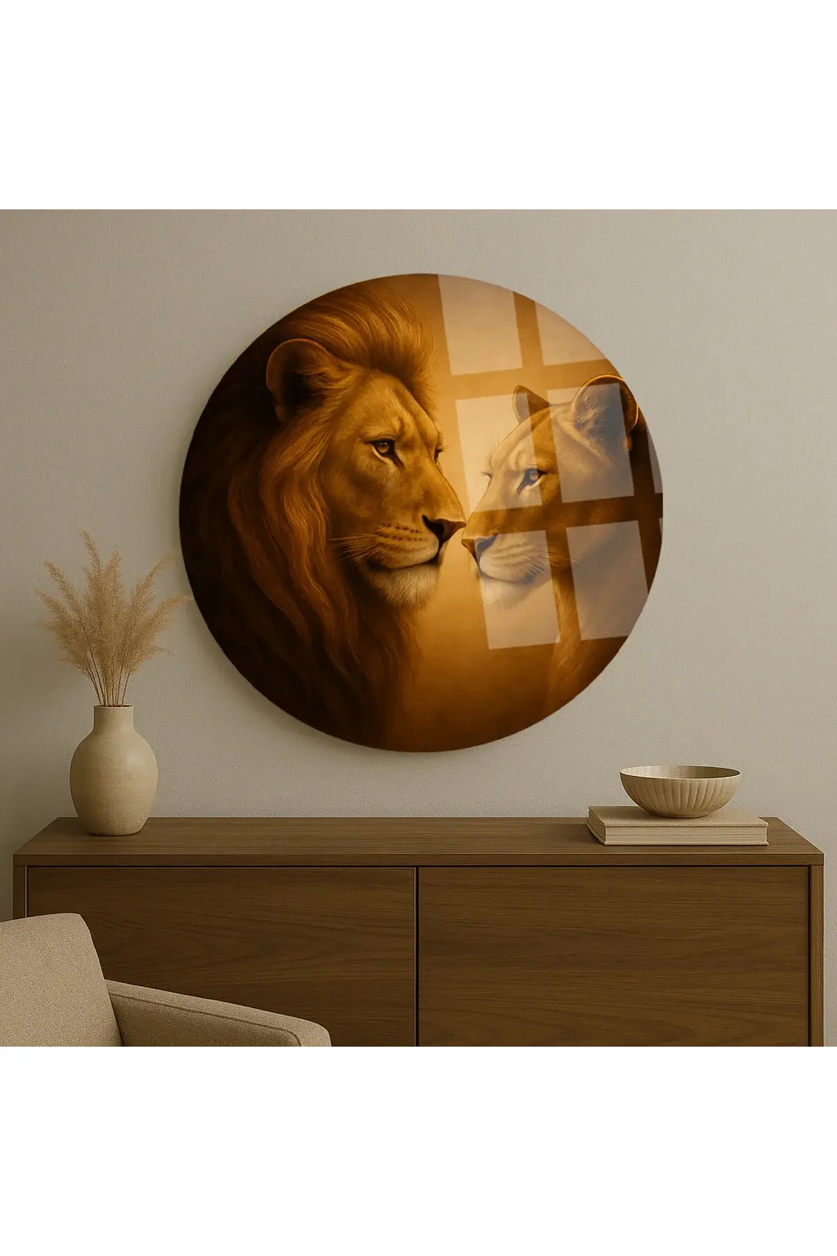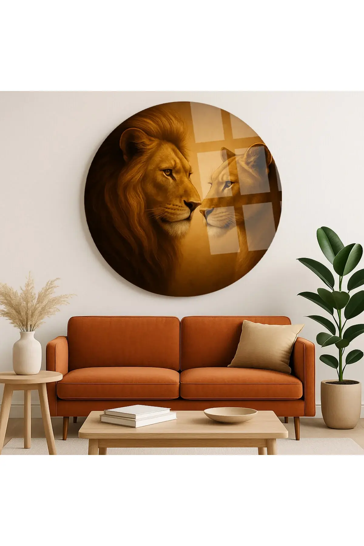 SEVİLİ ASLANLAR EVLİ ASLAN TASARIMI KIRILMAZ YUVARLAK CAM TABLO LÜKS EV HEDİYESİ ULTRA CANLI RENKLİ Kahverengi