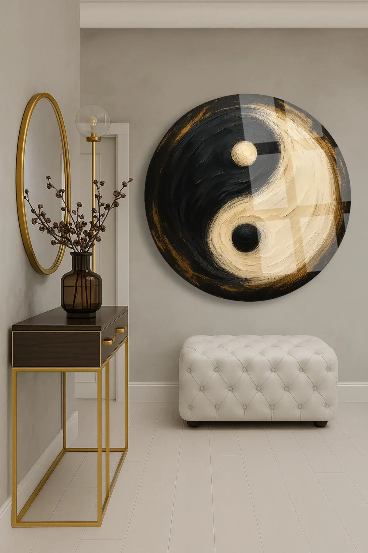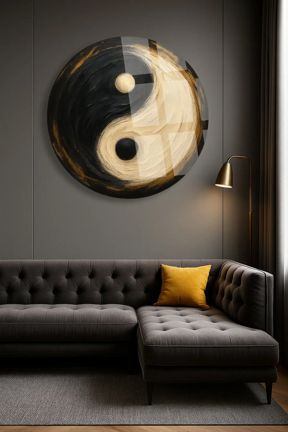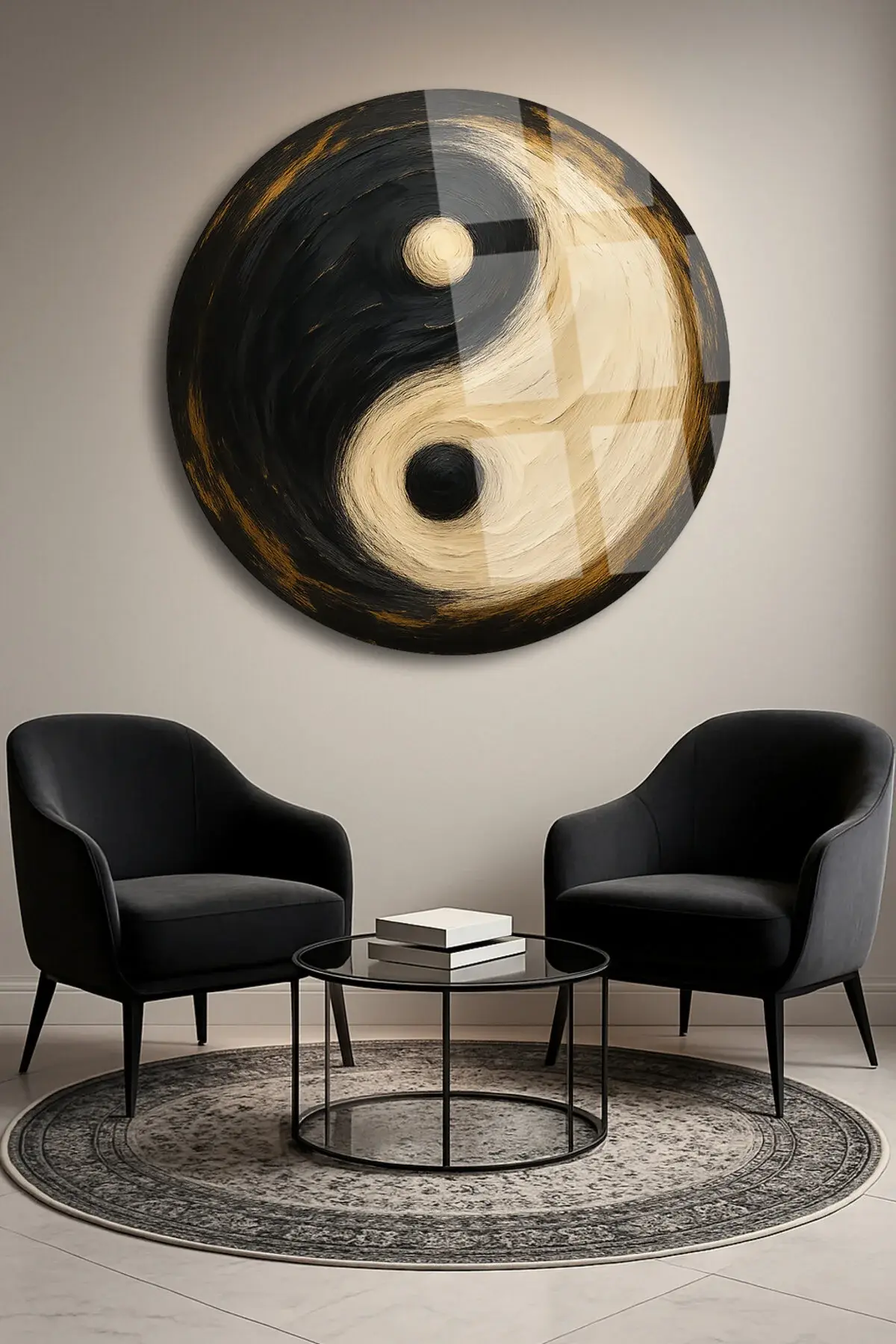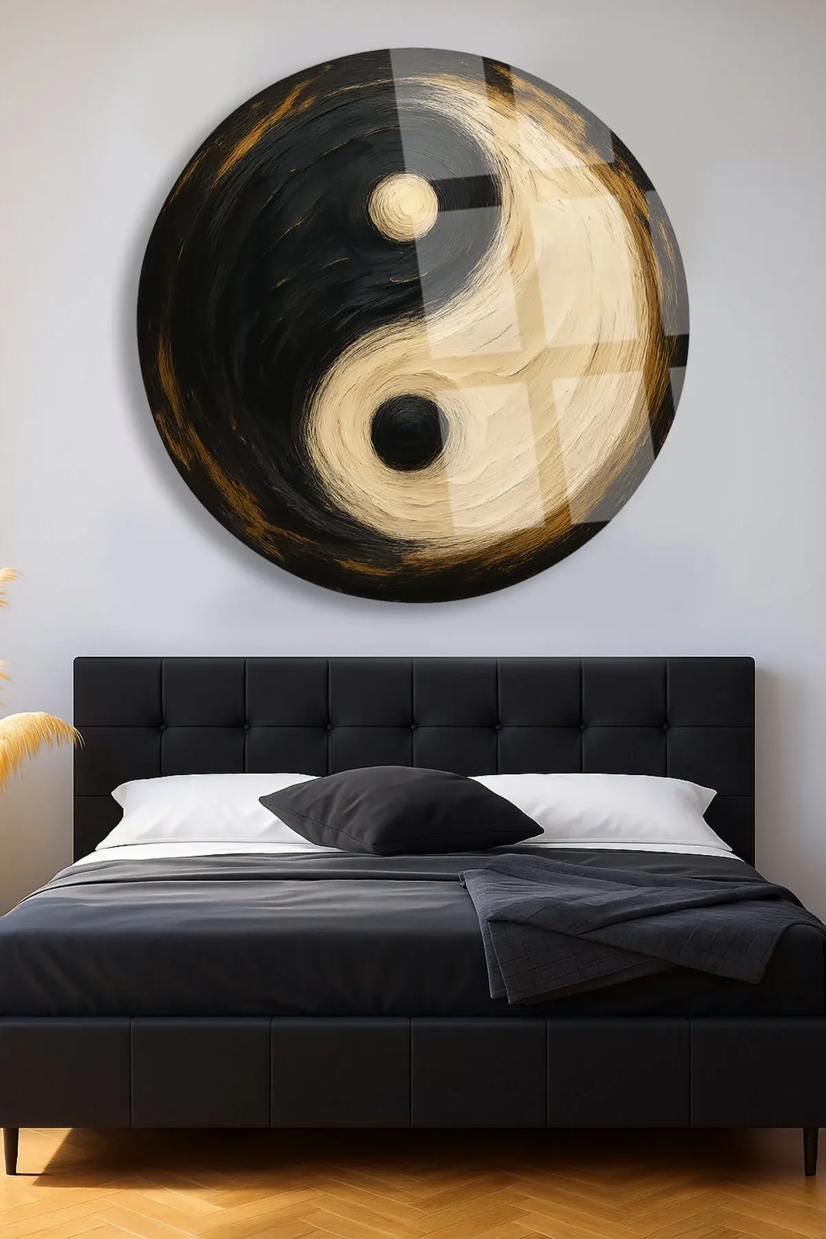 YİN YANG TASARIMI ULRTA CANLI RENKLER KIRILMAZ LÜKS MODERN YUVARLAK CAM TABLO EV HEDİYESİ Siyah
