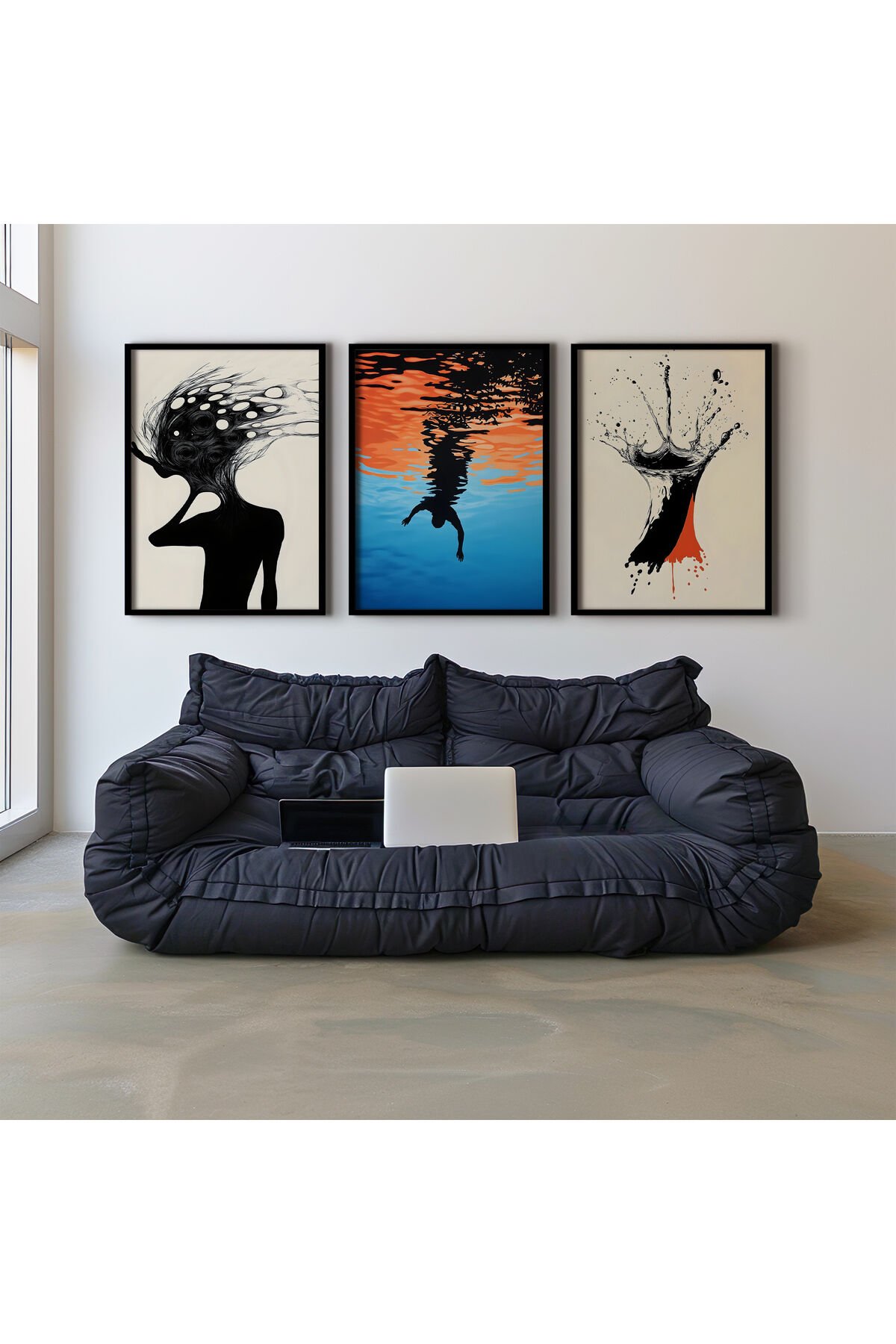 SİYAH - Abstract Bilinç ve Çığlık Üçlü Doğal Ahşap Çerçeveli Duvar Tablo Seti
