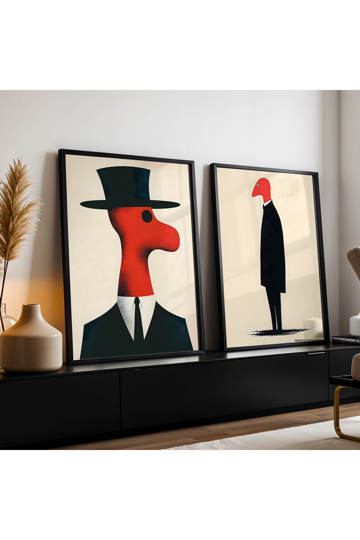 SİYAH - Abstract Figüratif Çizim İkili Doğal Ahşap Çerçeveli Duvar Tablo Seti