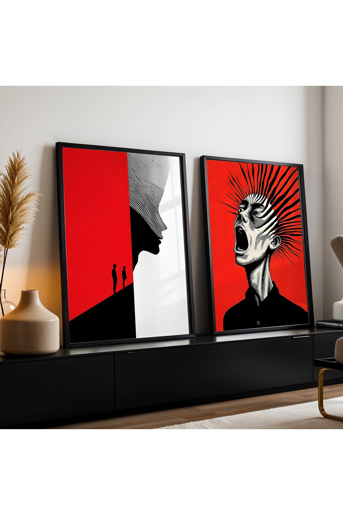 SİYAH - Abstract Figüratif Çizim İkili Doğal Ahşap Çerçeveli Duvar Tablo Seti