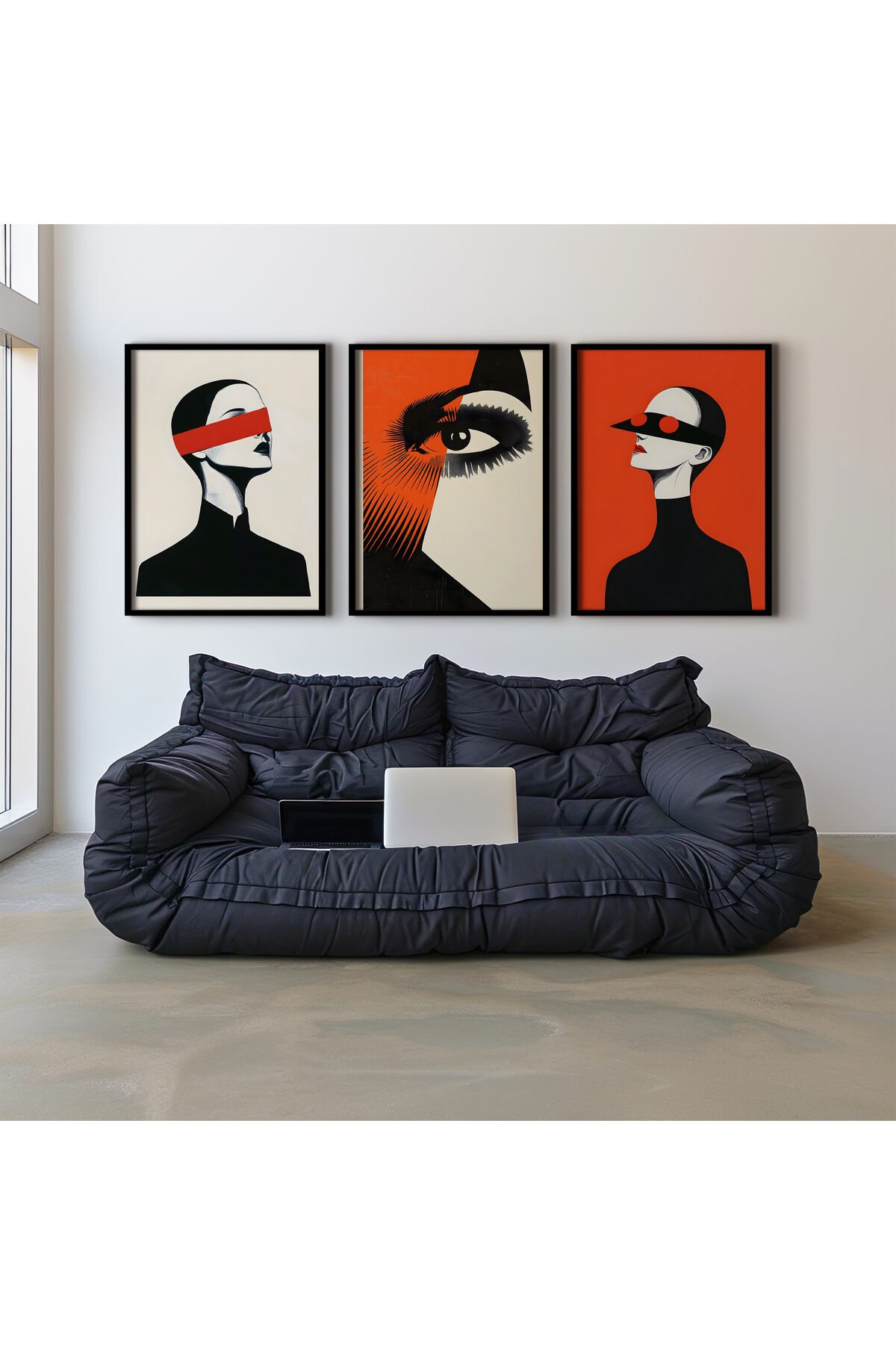 SİYAH - Abstract Figüratif Sanat Üçlü Doğal Ahşap Çerçeveli Duvar Tablo Seti