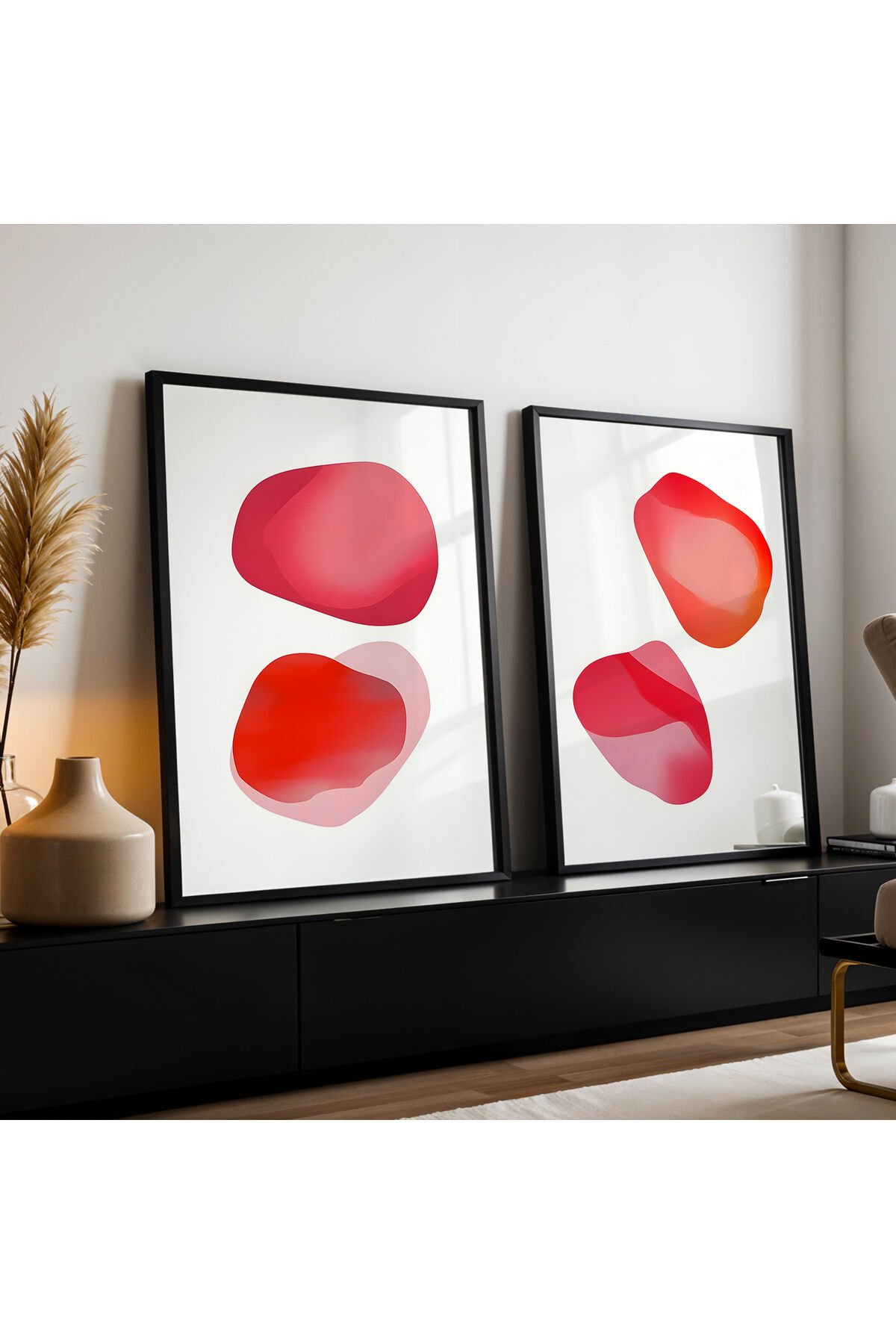 SİYAH - Abstract Geometrik Şekiller İkili Doğal Ahşap Çerçeveli Duvar Tablo Seti