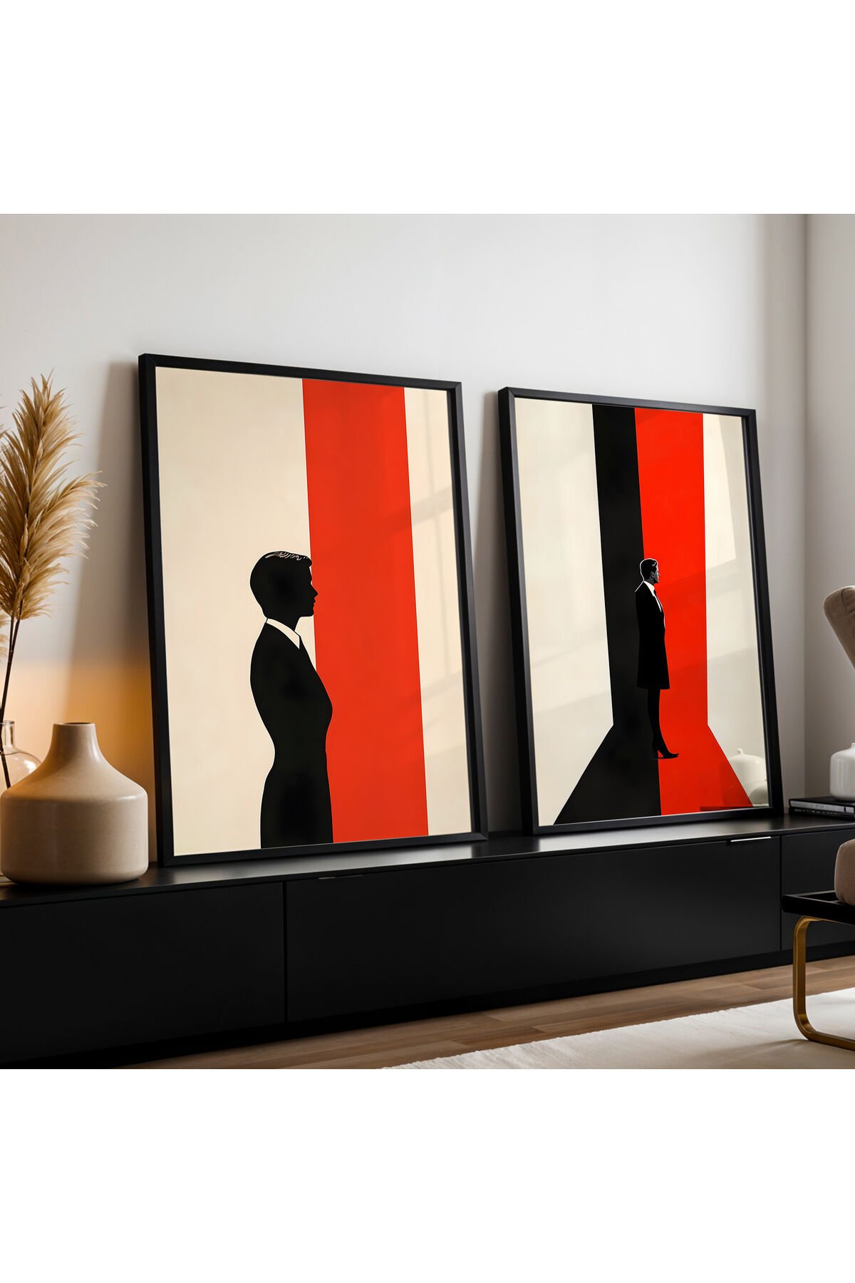 SİYAH - Abstract İnsan Figürü İkili Doğal Ahşap Çerçeveli Duvar Tablo Seti