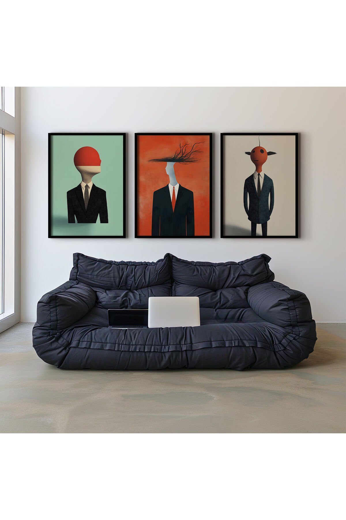 SİYAH - Abstract Modern Figüratif Sana Üçlü Doğal Ahşap Çerçeveli Duvar Tablo Seti