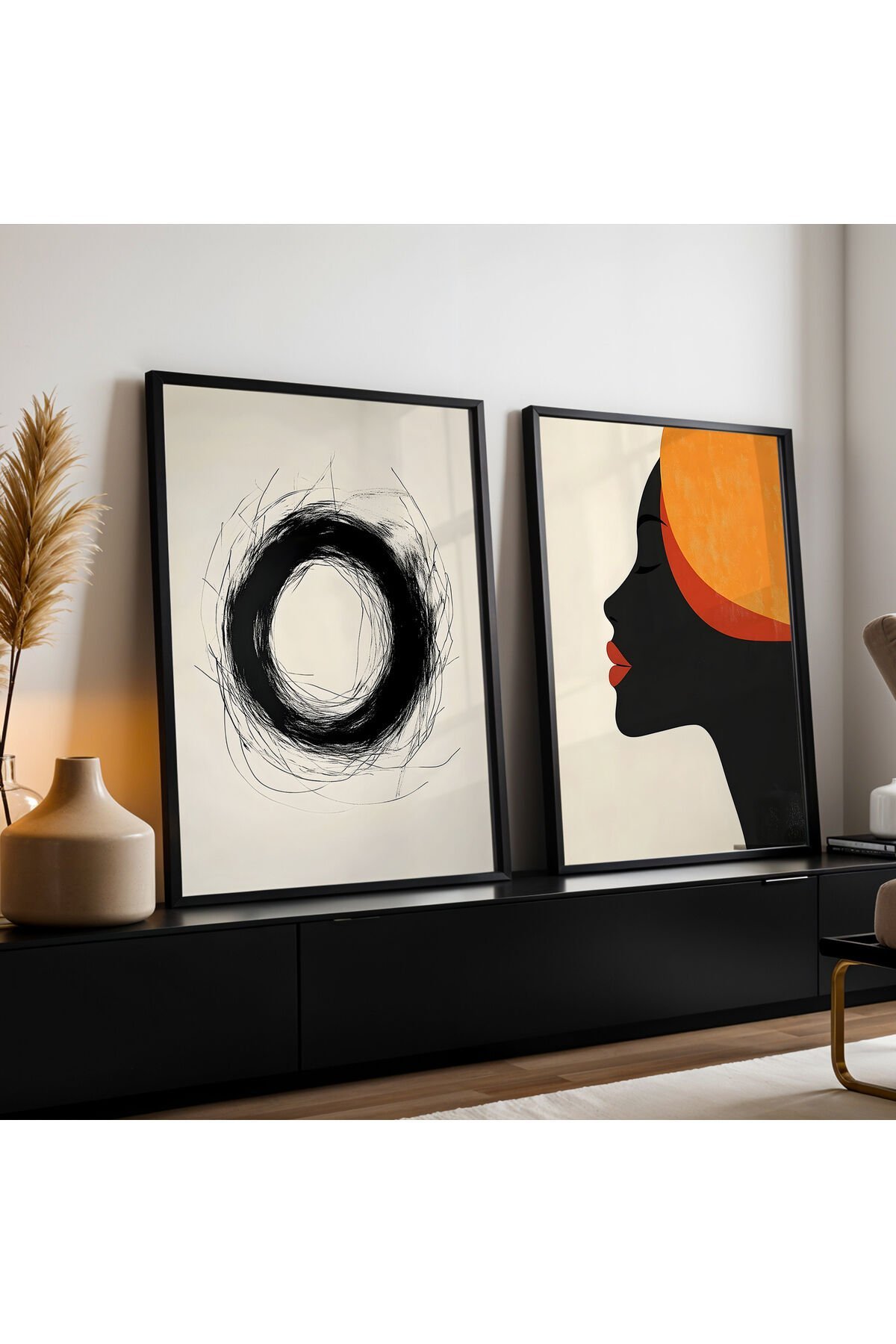 SİYAH - Abstract Modern Figüratif Sanat İkili Doğal Ahşap Çerçeveli Duvar Tablo Seti