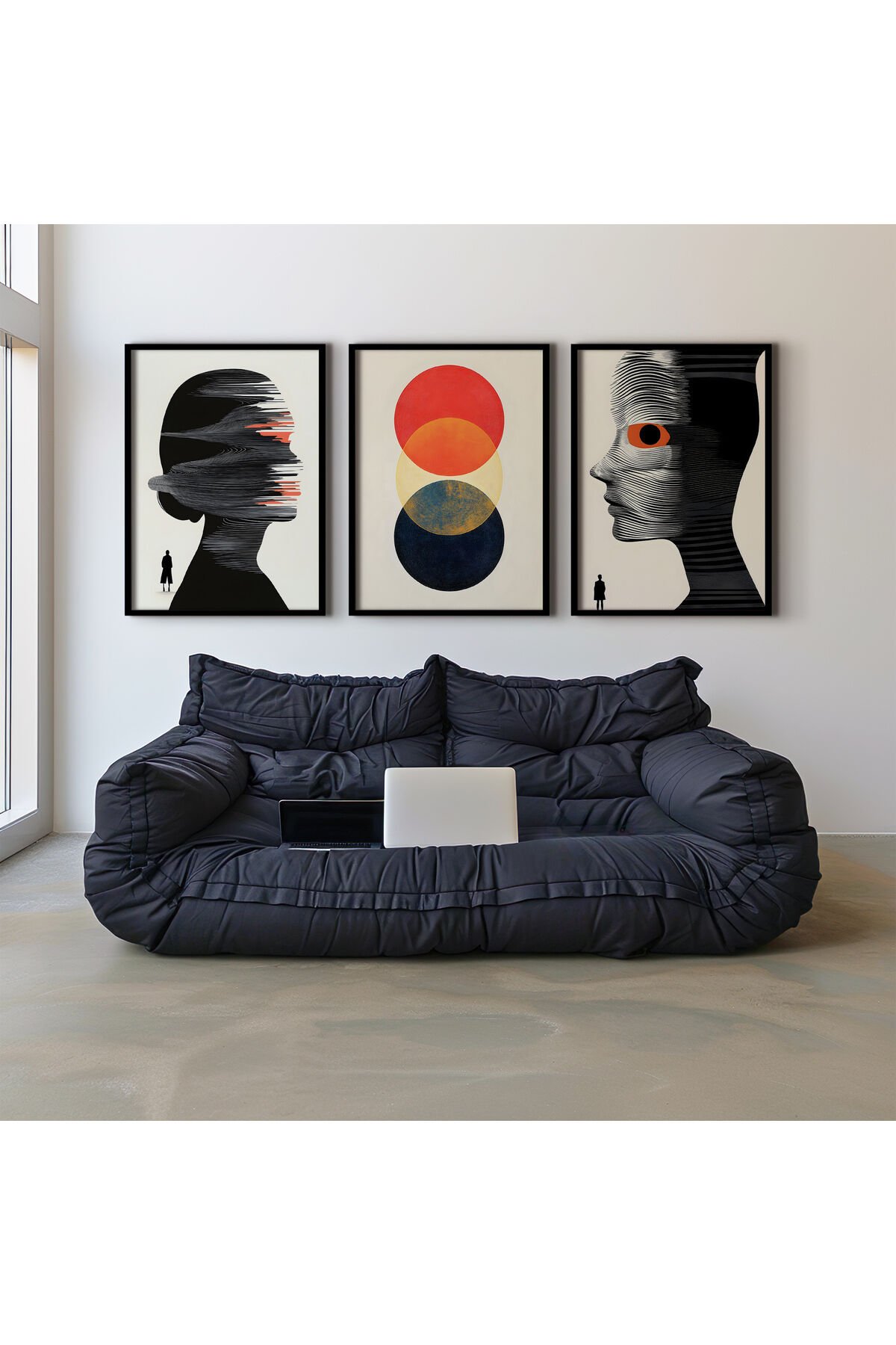 SİYAH - Abstract Modern Figüratif Sanat Üçlü Doğal Ahşap Çerçeveli Duvar Tablo Seti