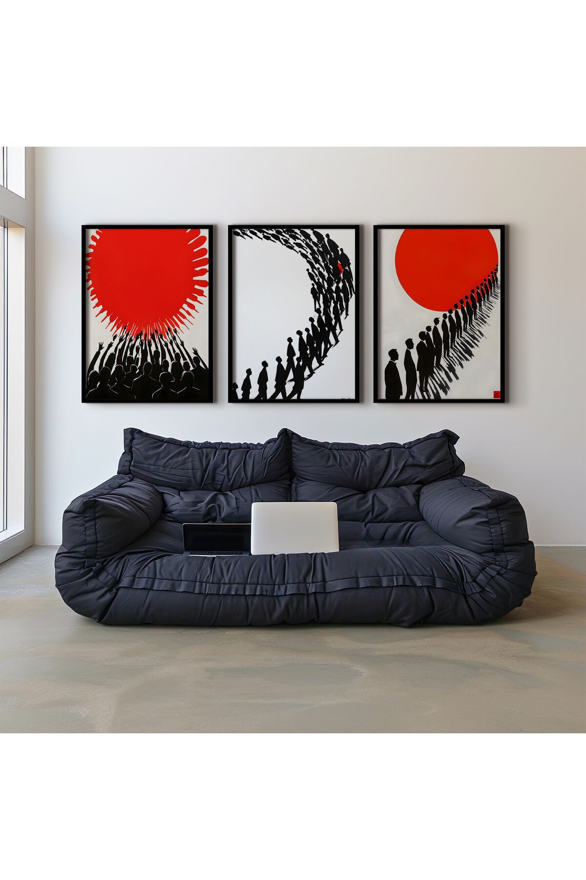 SİYAH - Abstract Modern İnsan Figüratif Sanat Üçlü Doğal Ahşap Çerçeveli Duvar Tablo Seti