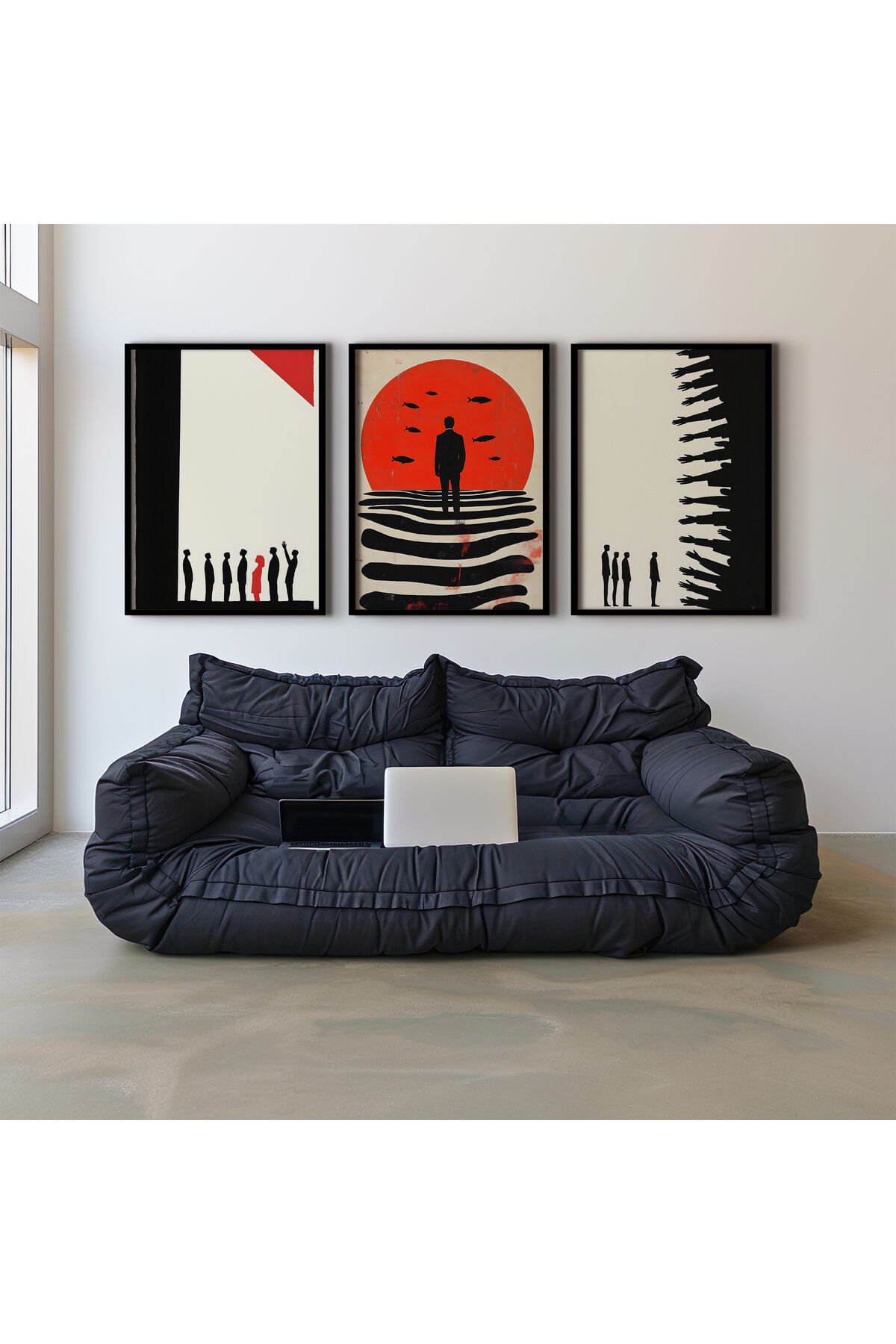 SİYAH - Abstract Modern İnsan Figüratif Sanat Üçlü Doğal Ahşap Çerçeveli Duvar Tablo Seti