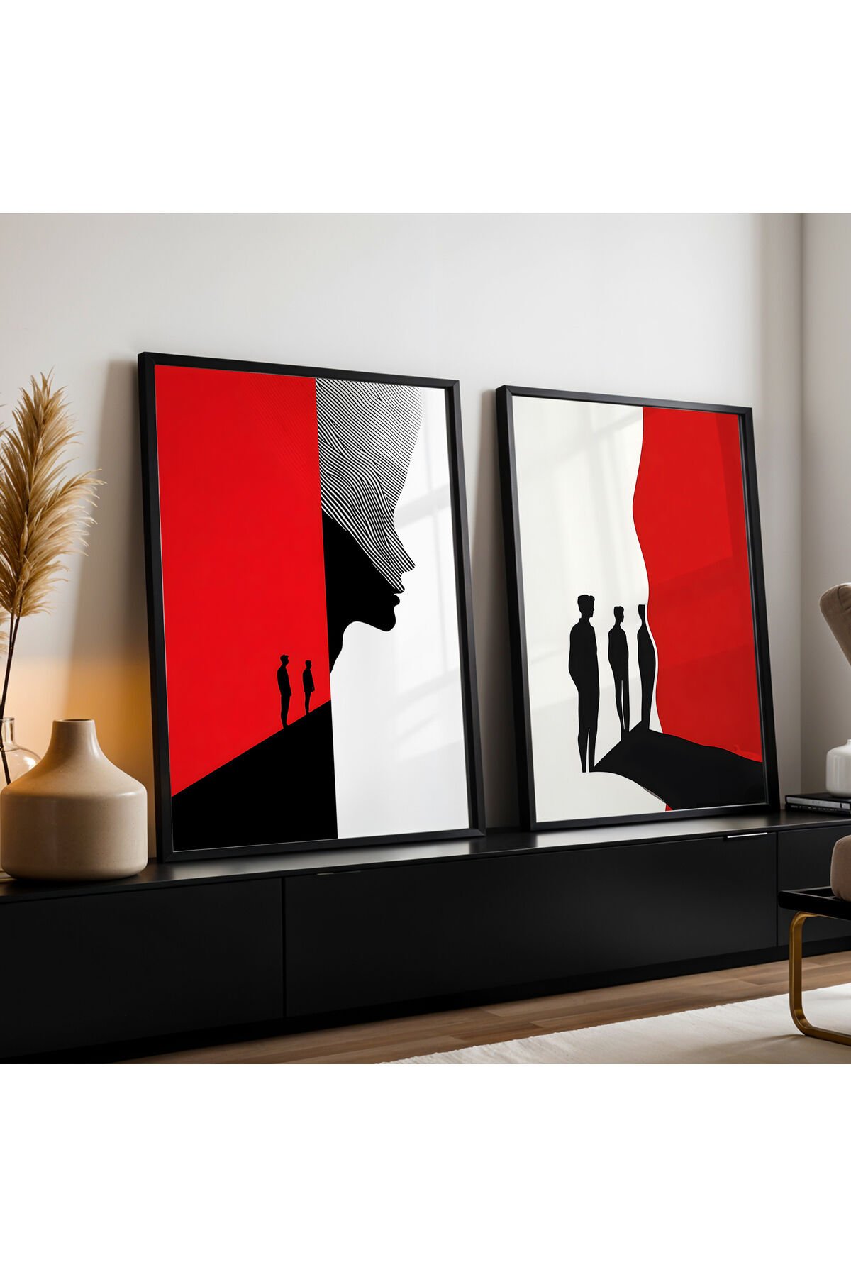 SİYAH - Abstract Modern Siluet Sanatı İkili Doğal Ahşap Çerçeveli Duvar Tablo Seti