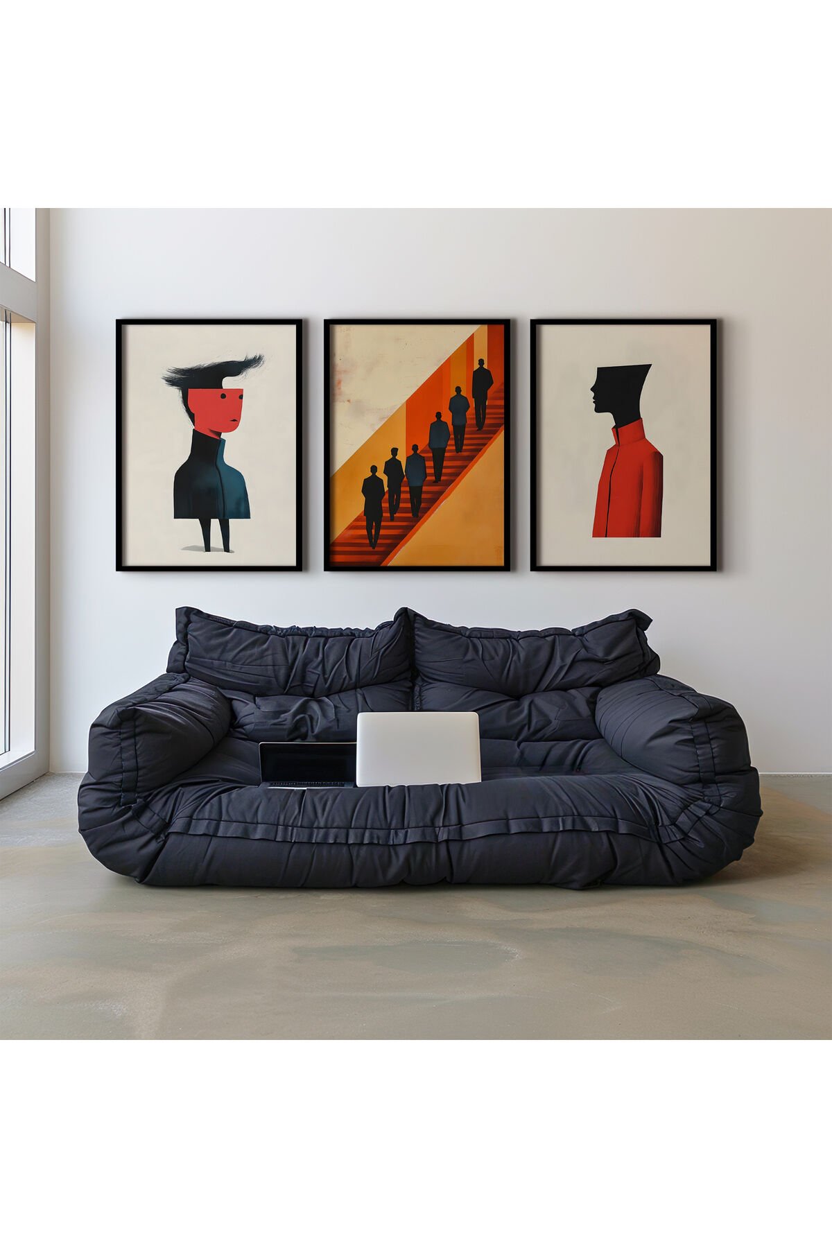 SİYAH - Abstract Portve Ve İnsan Figürleri Üçlü Doğal Ahşap Çerçeveli Duvar Tablo Seti
