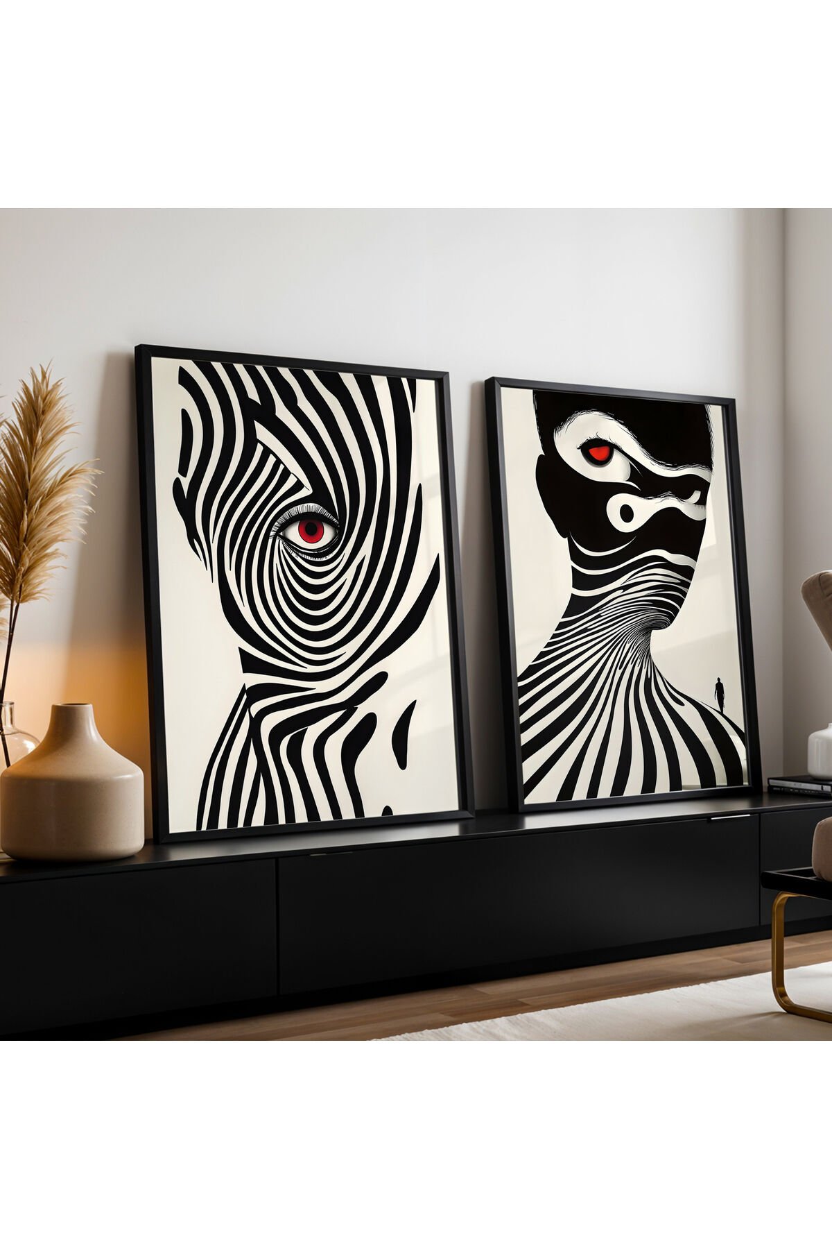 SİYAH - Abstract Psikolojik Derinlikli Sanat İkili Doğal Ahşap Çerçeveli Duvar Tablo Seti