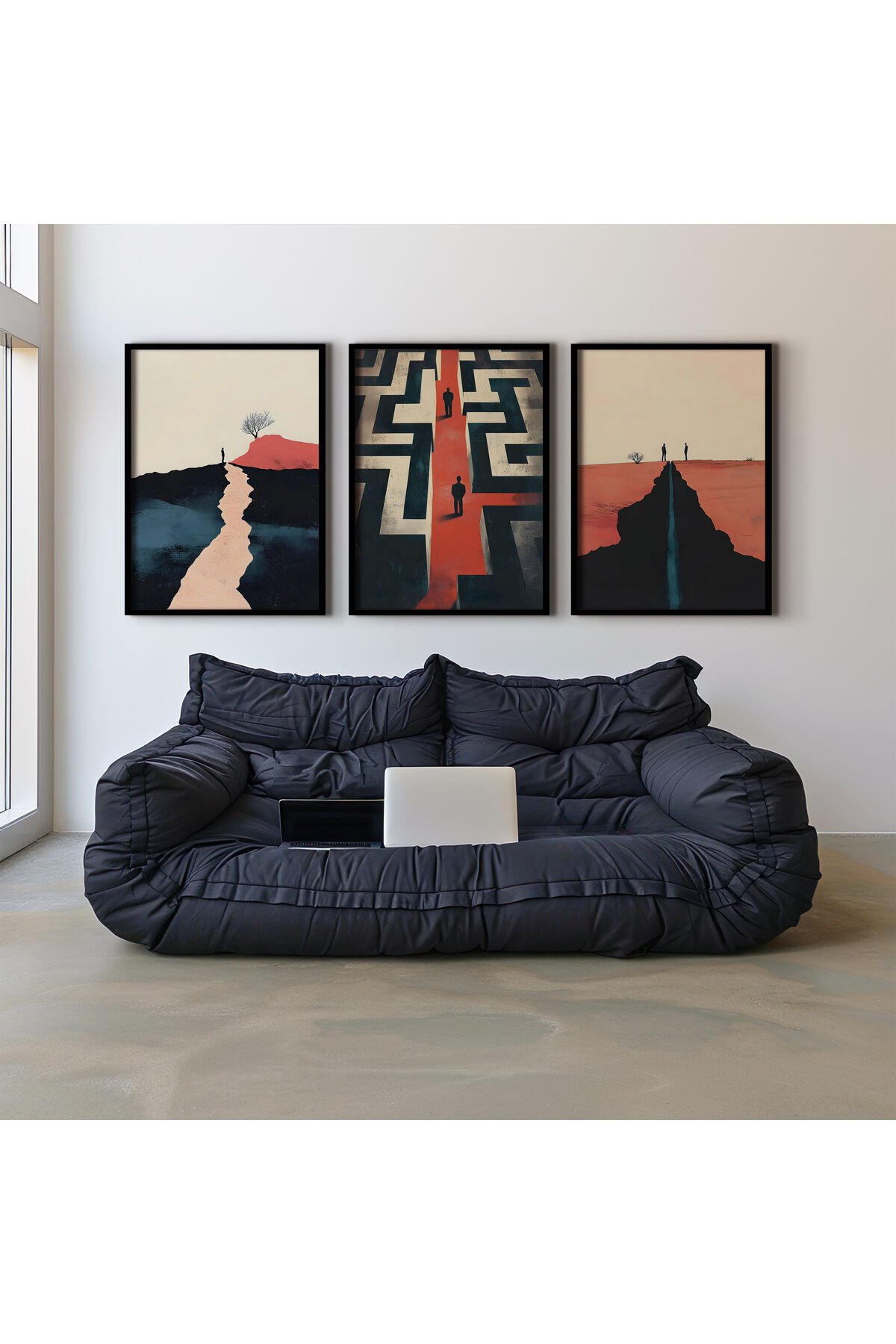 SİYAH - Abstract Red Bilinçaltı ve Labirent Üçlü Doğal Ahşap Çerçeveli Duvar Tablo Seti