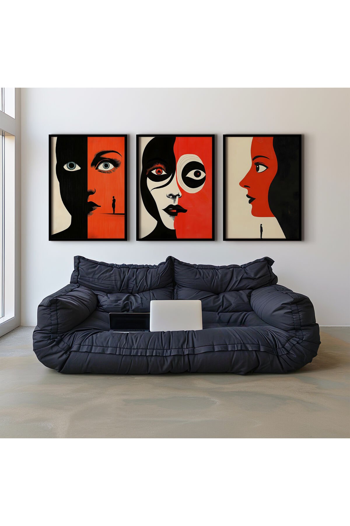 SİYAH - Abstract Red Figüratif Sanat Üçlü Doğal Ahşap Çerçeveli Duvar Tablo Seti