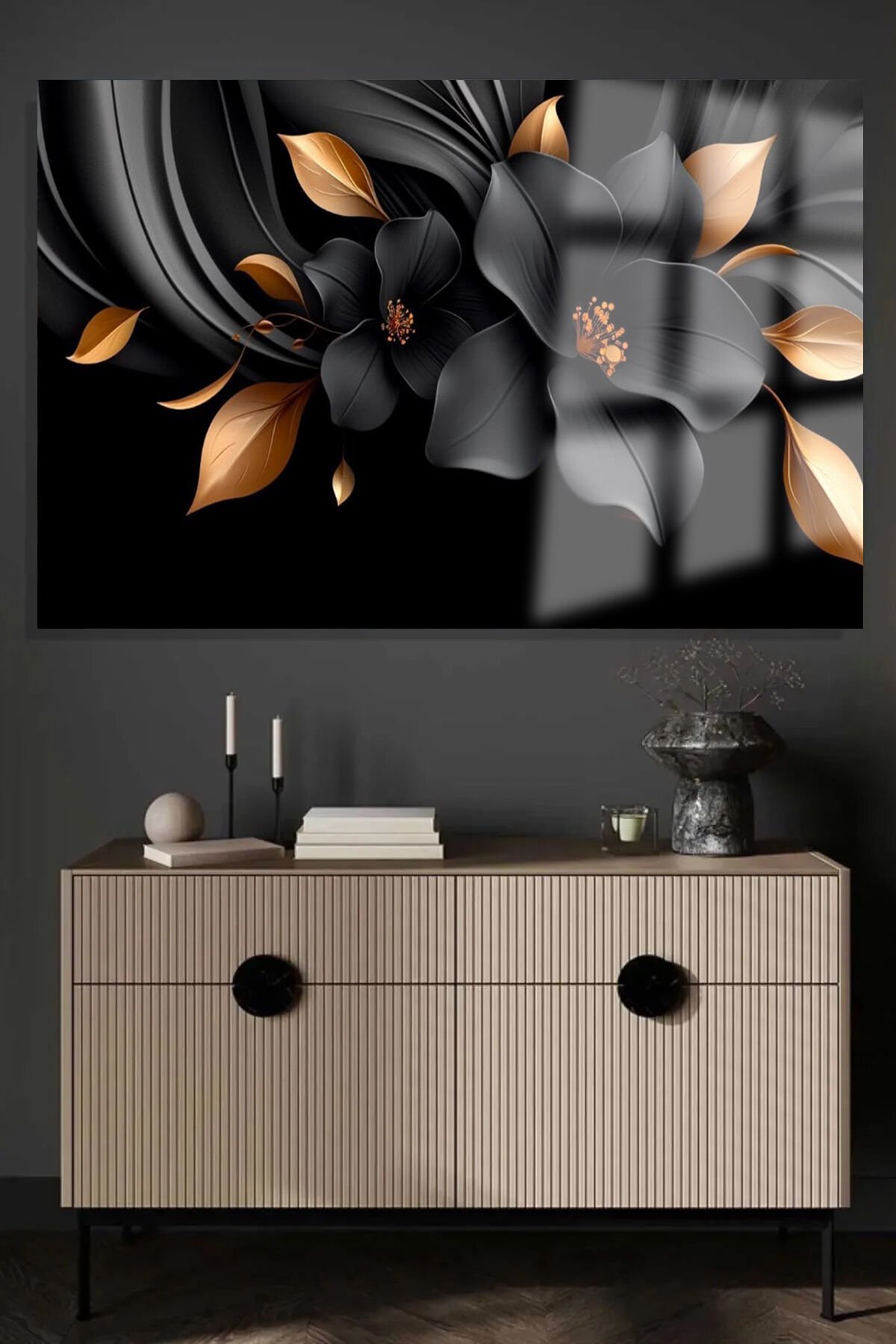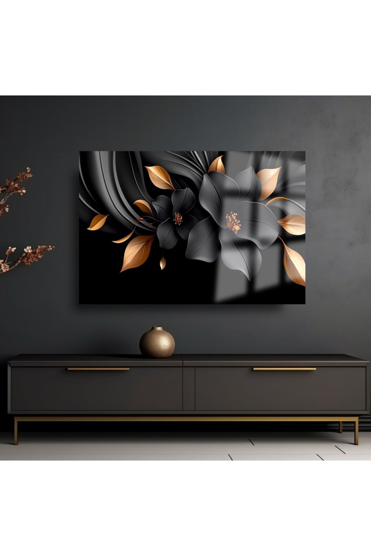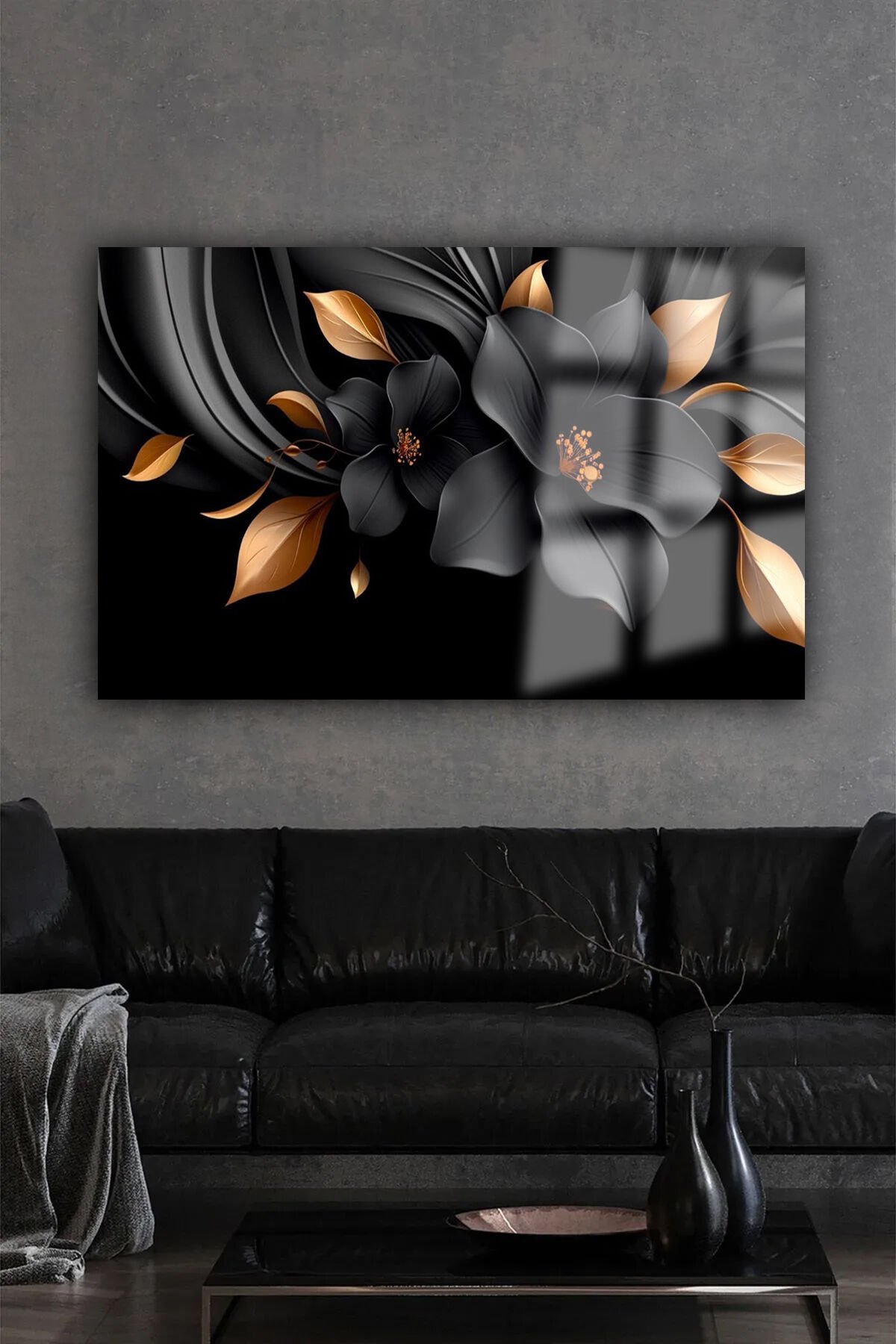 SİYAH ALTIN GOLD YAPRAKLI YATAY ÇİÇEK KIRILMAZ LÜKS CAM TABLO OF İŞ YERİ EV HEDİYESİ CAM TABLO