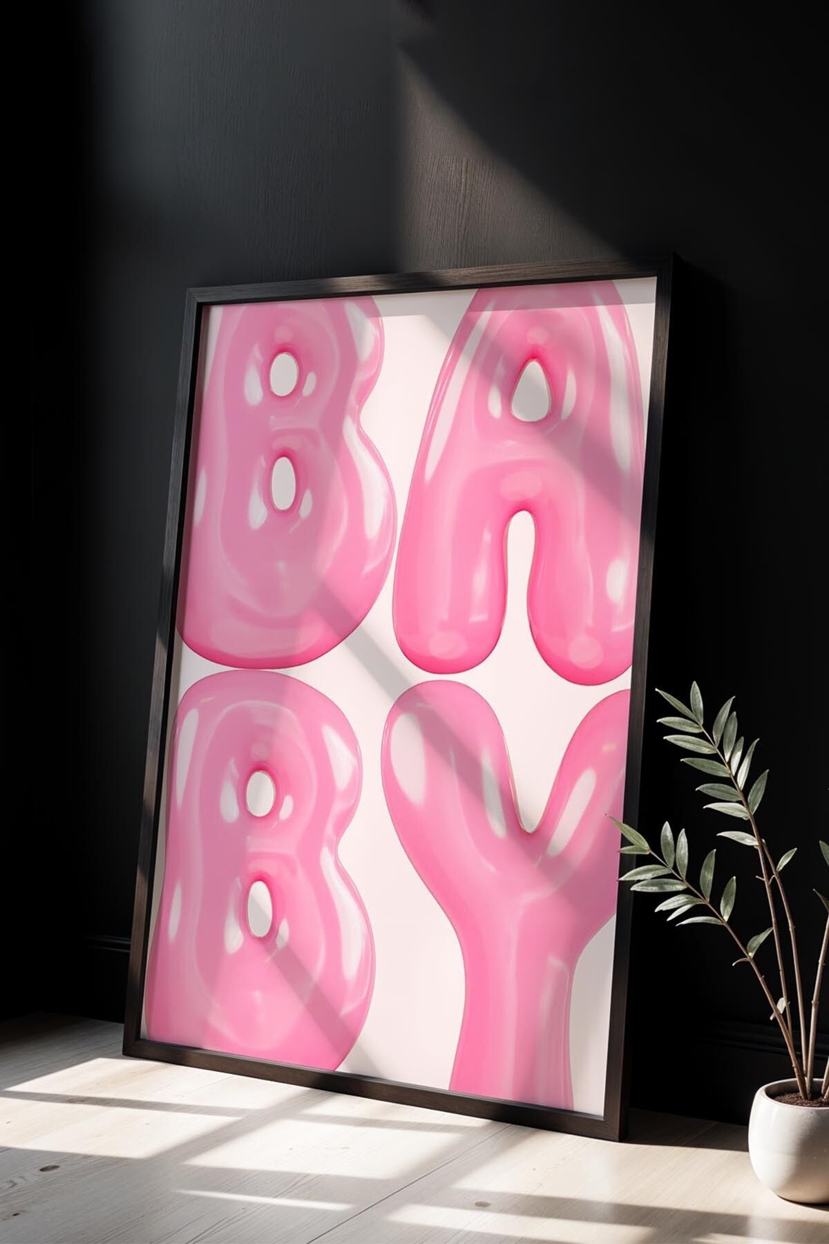 SİYAH - BABY Yazı 3D Pembe Trendy Maksimalist Sanatı Ahşap Çerçeveli Duvar Tablosu