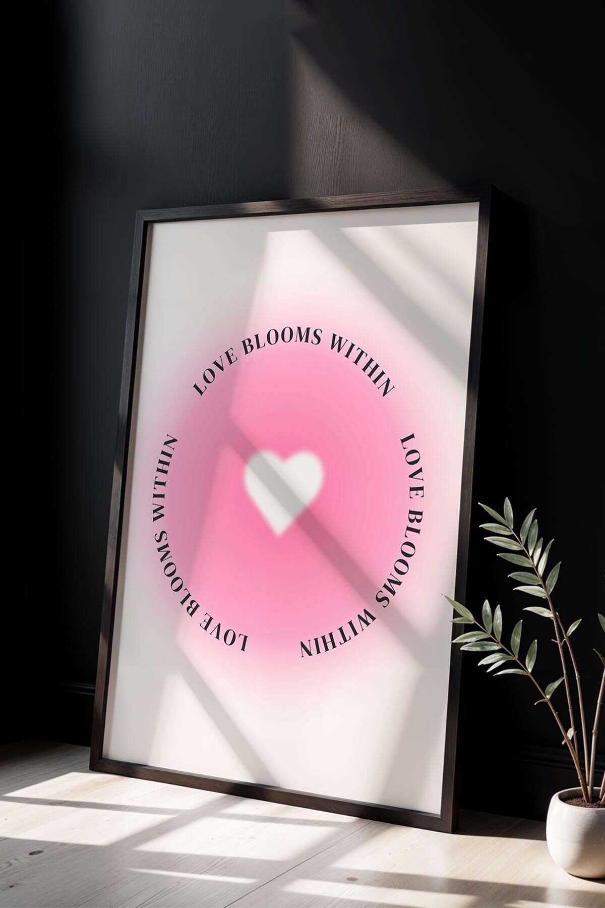 SİYAH - Balon Kalp Figürü Gri Maksimalist Sanatı Ahşap Çerçeveli Duvar Tablosu
