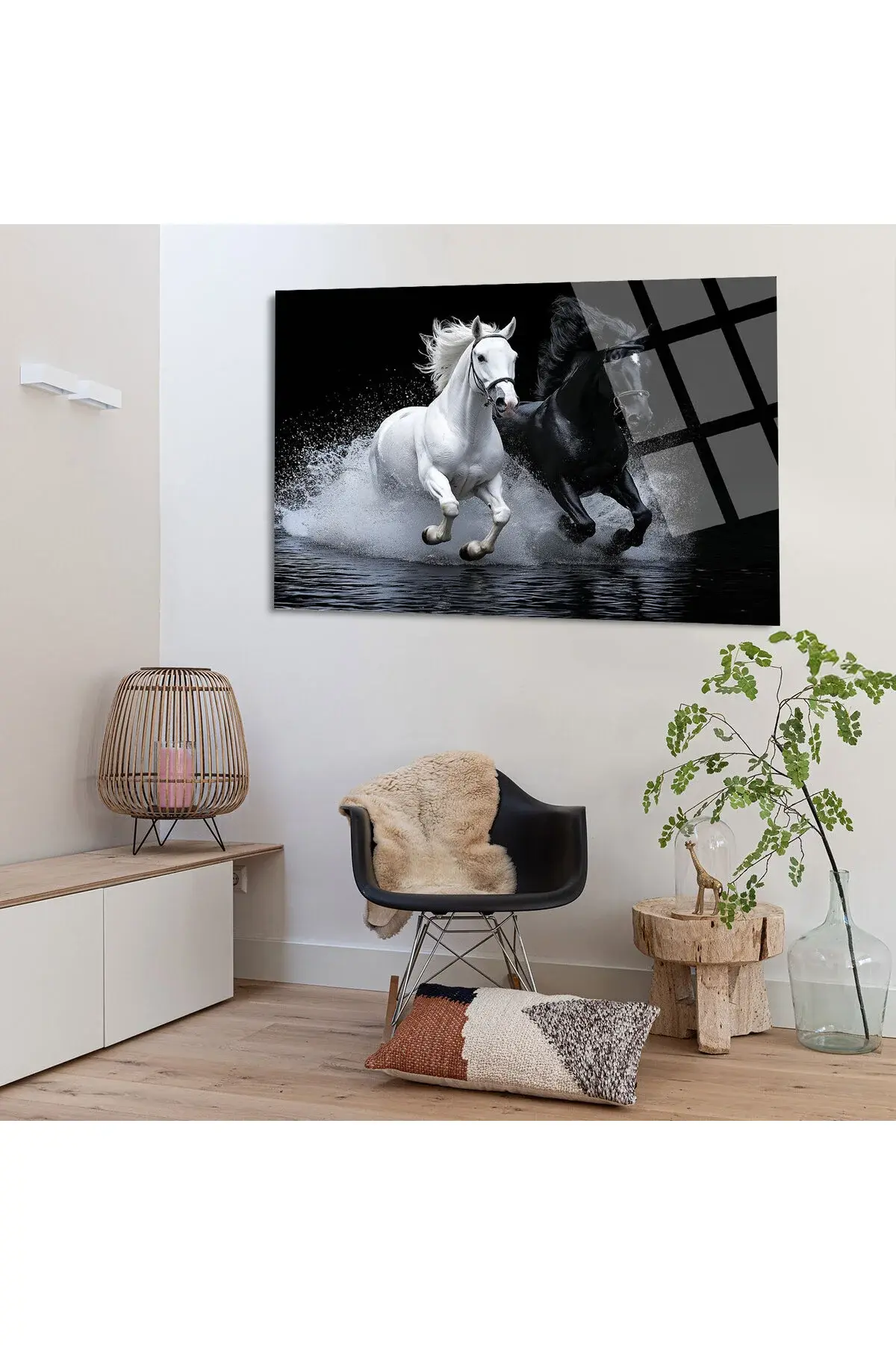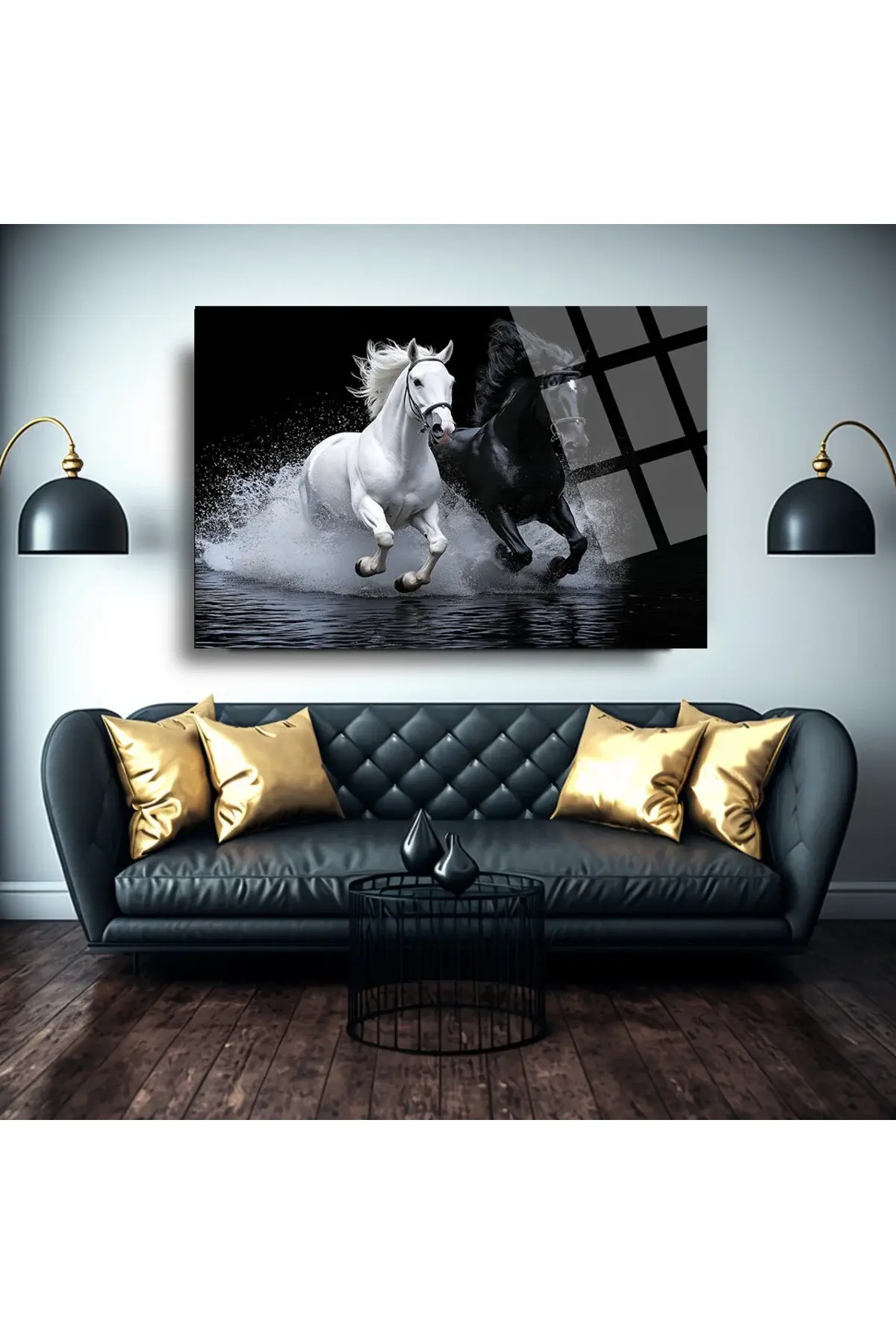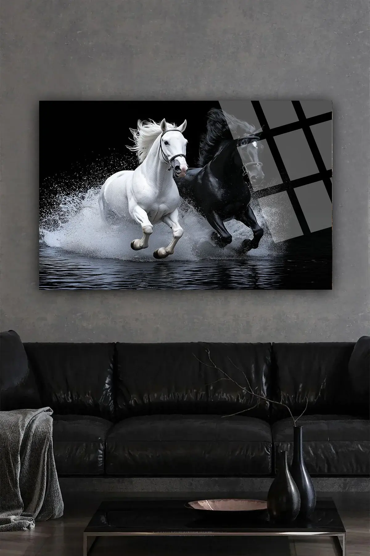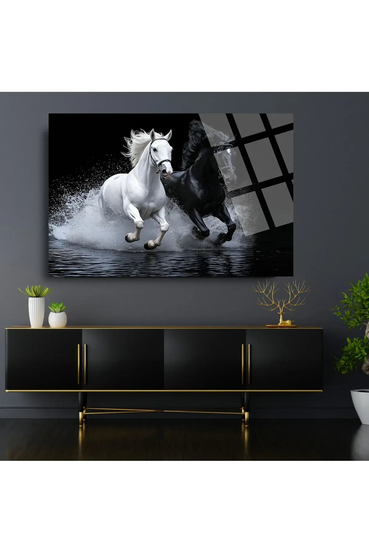 SİYAH BEYAZ GÖRKEMLİ ASİL ATLAR LÜKS KIRILMAZ CAM TABLO EV HEDİYESİ İŞ YERİ HEDİYESİ Siyah