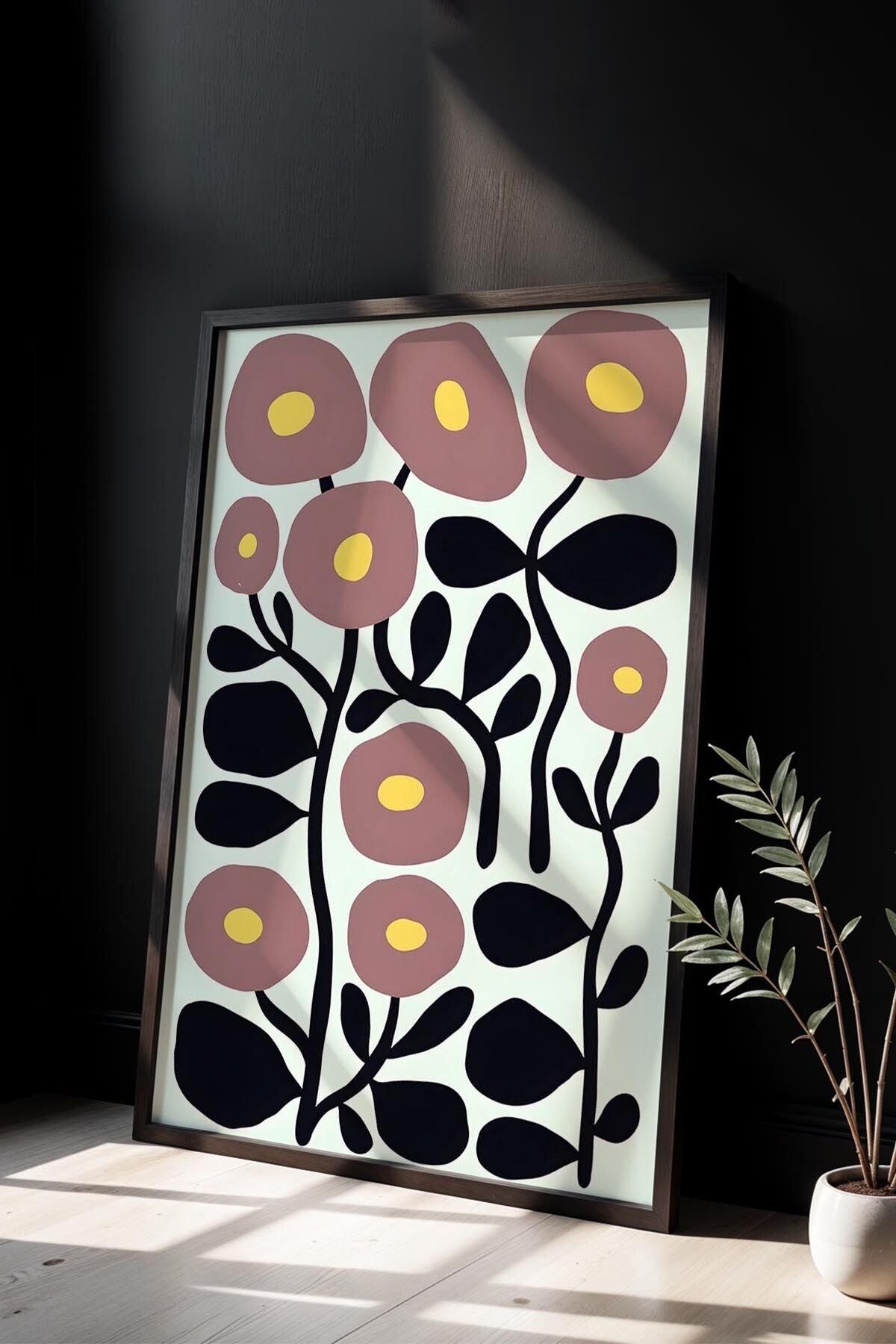 SİYAH - Botanik Serisi Gül Kurusu Çiçekli Matisse Doğal Ahşap Çerçeveli Duvar Tablosu