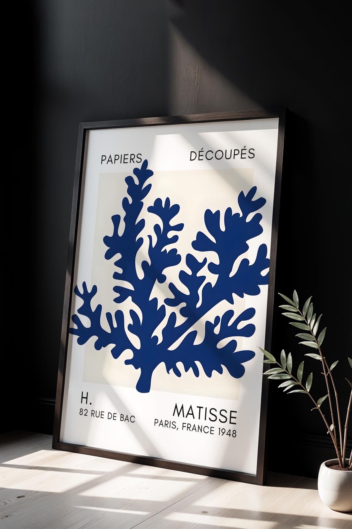 SİYAH - Botanik Serisi Lacivert Çiçekli Matisse Doğal Ahşap Çerçeveli Duvar Tablosu BHM-227t