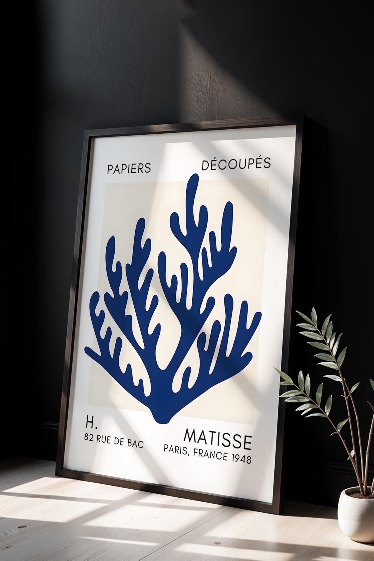 SİYAH - Botanik Serisi Lacivert Çiçekli Matisse Doğal Ahşap Çerçeveli Duvar Tablosu BHM-225t