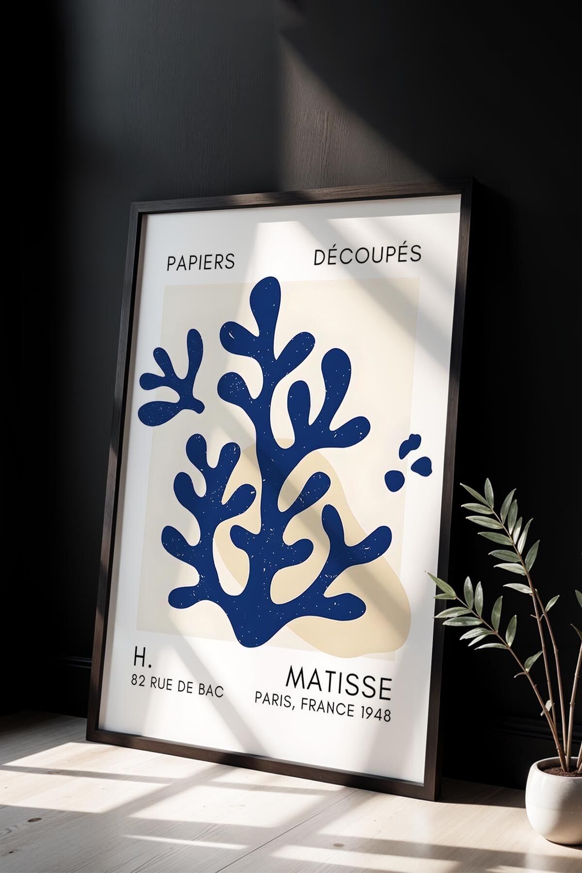 SİYAH - Botanik Serisi Lacivert Çiçekli Matisse Doğal Ahşap Çerçeveli Duvar Tablosu