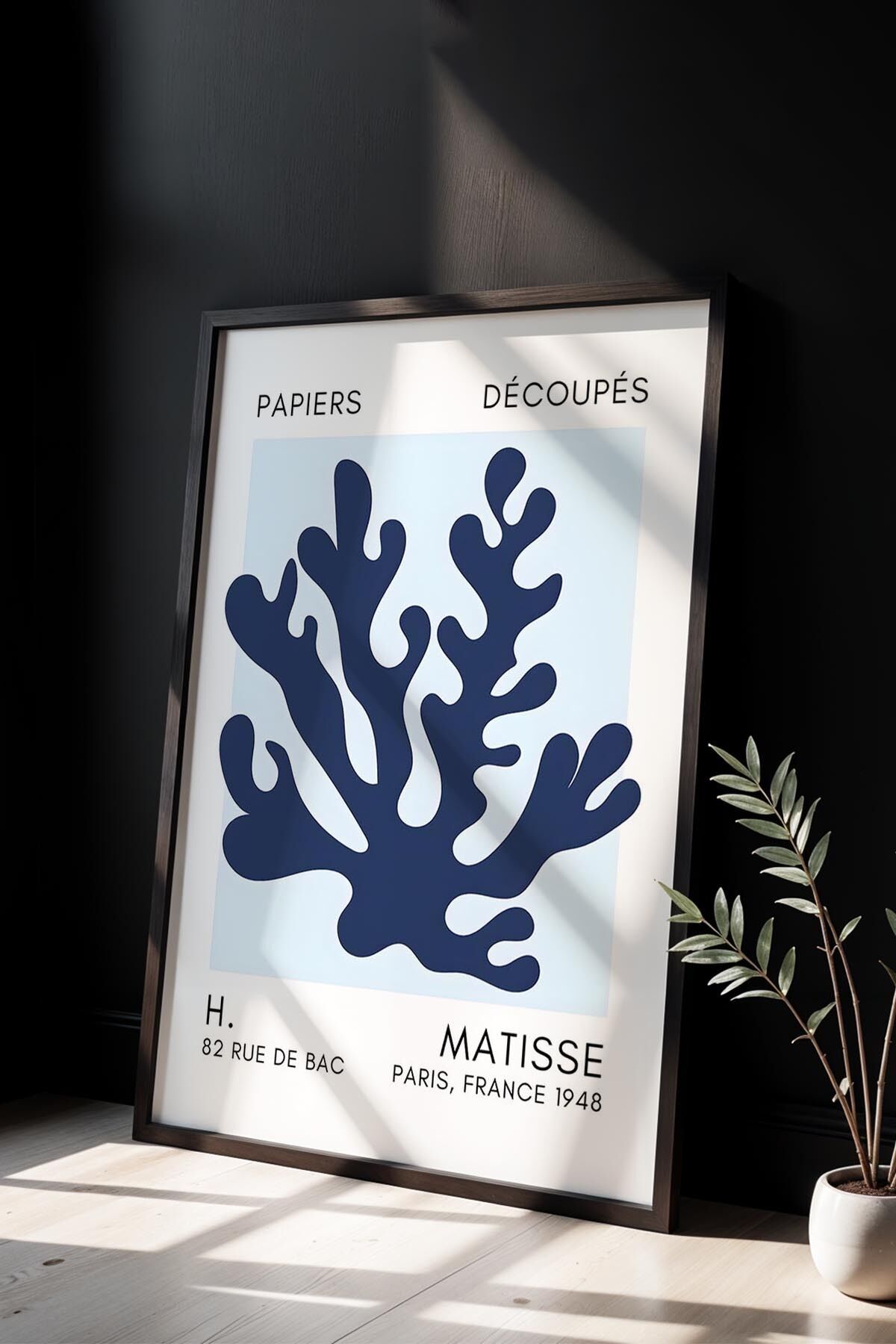 SİYAH - Botanik Serisi Mavi Çiçekli Matisse Doğal Ahşap Çerçeveli Duvar Tablosu BHM-122t