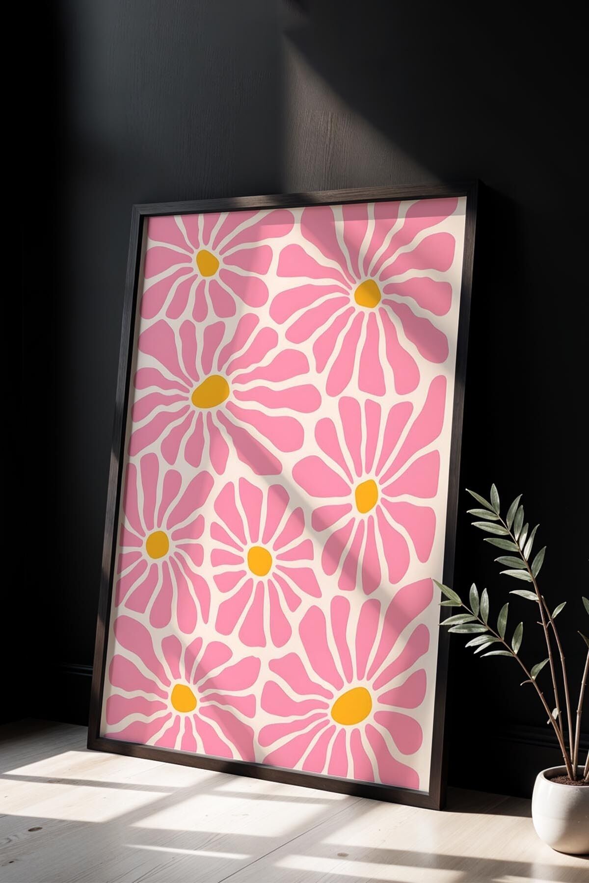 SİYAH - Botanik Serisi Pembe Çiçekli Matisse Doğal Ahşap Çerçeveli Duvar Tablosu