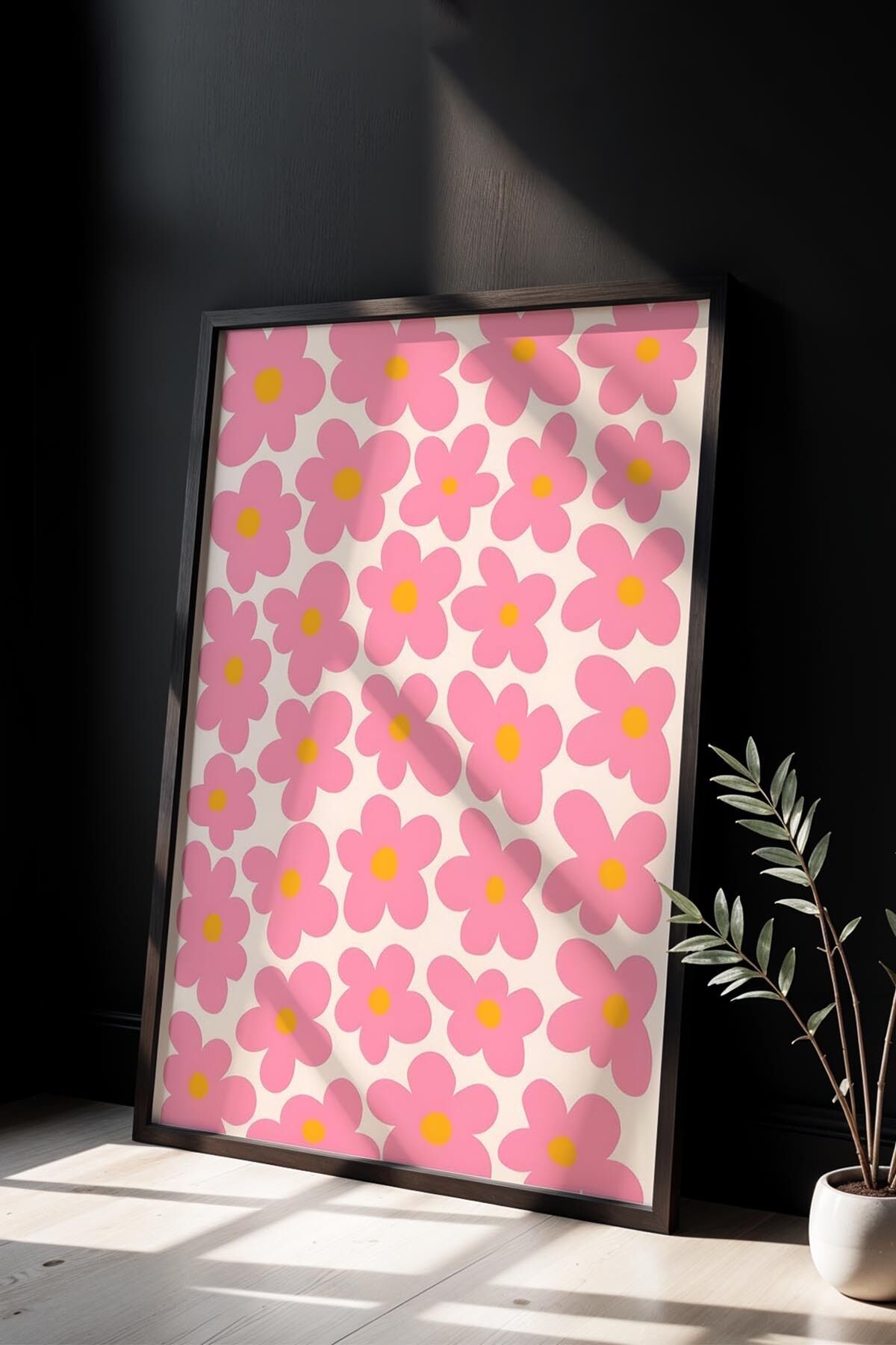SİYAH - Botanik Serisi Pembe Çiçekli Matisse Doğal Ahşap Çerçeveli Duvar Tablosu