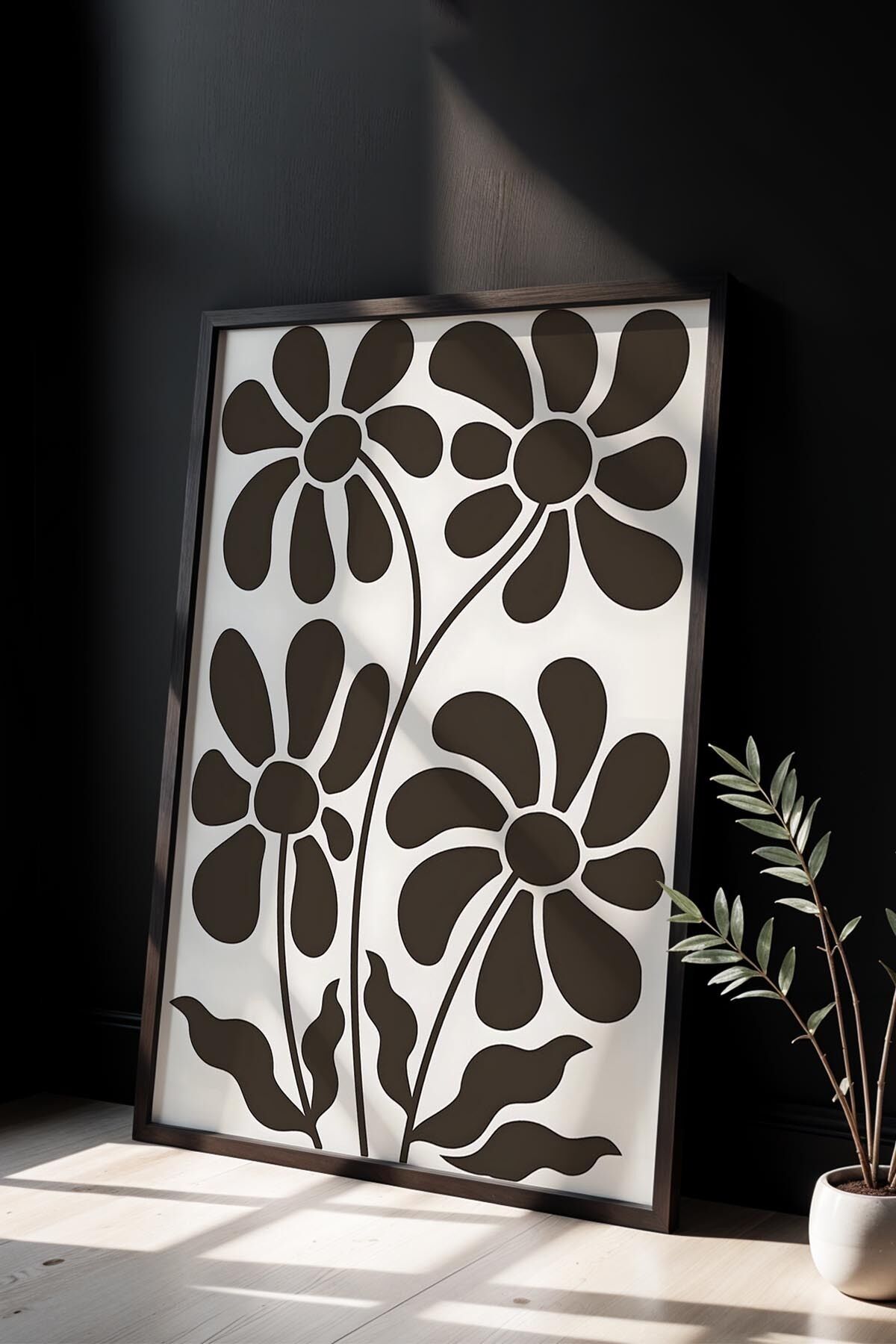 SİYAH - Botanik Serisi Siyah Çiçekli Minimalist Matisse Doğal Ahşap Çerçeveli Duvar Tablosu