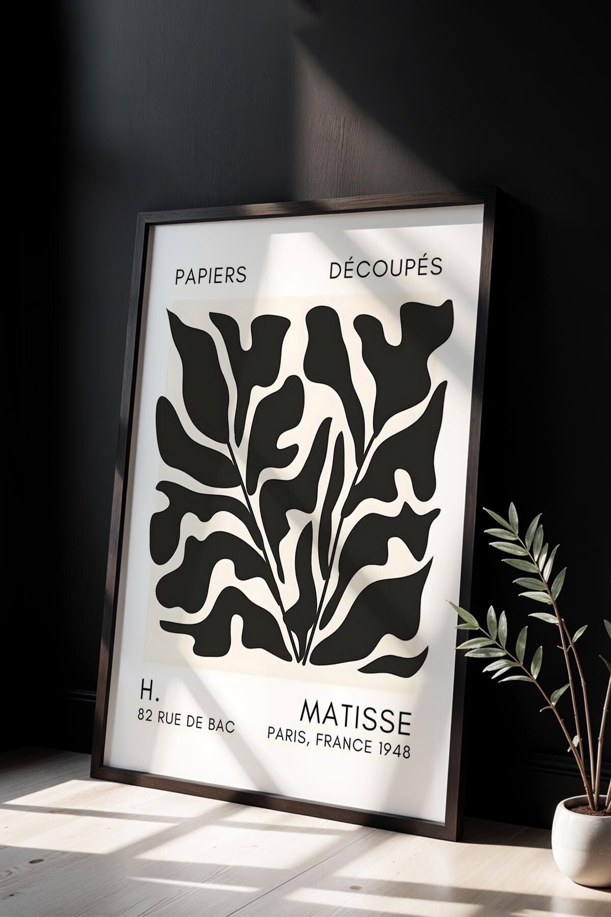 SİYAH - Botanik Serisi Siyah Çiçekli Minimalist Matisse Doğal Ahşap Çerçeveli Duvar Tablosu
