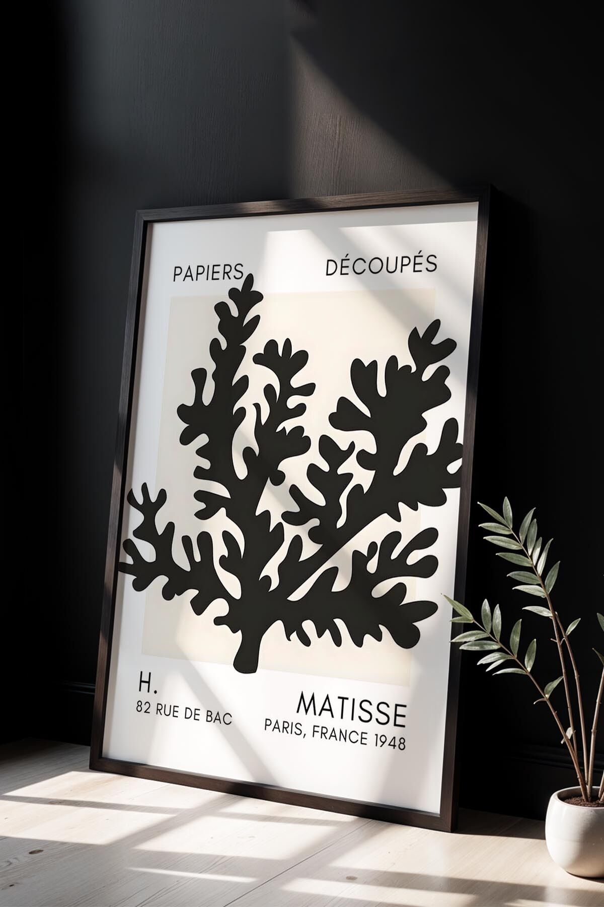 SİYAH - Botanik Serisi Siyah Çiçekli Minimalist Matisse Doğal Ahşap Çerçeveli Duvar Tablosu