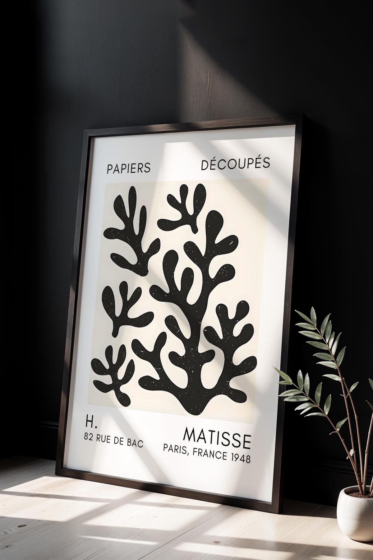 SİYAH - Botanik Serisi Siyah Çiçekli Minimalist Matisse Doğal Ahşap Çerçeveli Duvar Tablosu