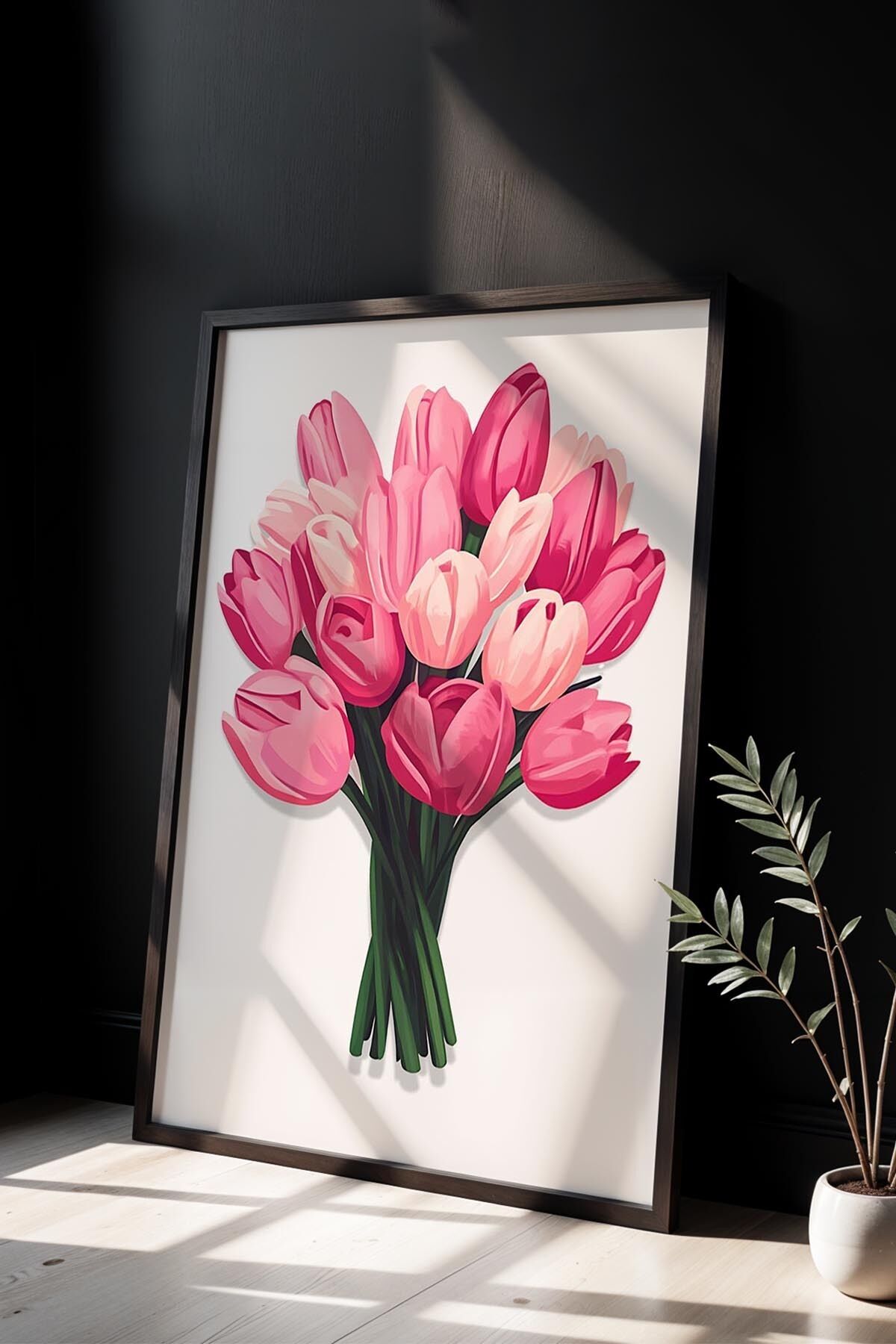 SİYAH - Çiçek Buketi Pembe Trendy Maksimalist Sanatı Ahşap Çerçeveli Duvar Tablosu