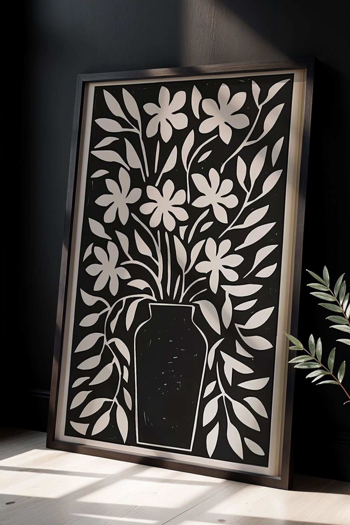 SİYAH - Çiçek Vazosu Siyah Beyaz Baskı Sanatı Ahşap Çerçeveli Duvar Tablosu