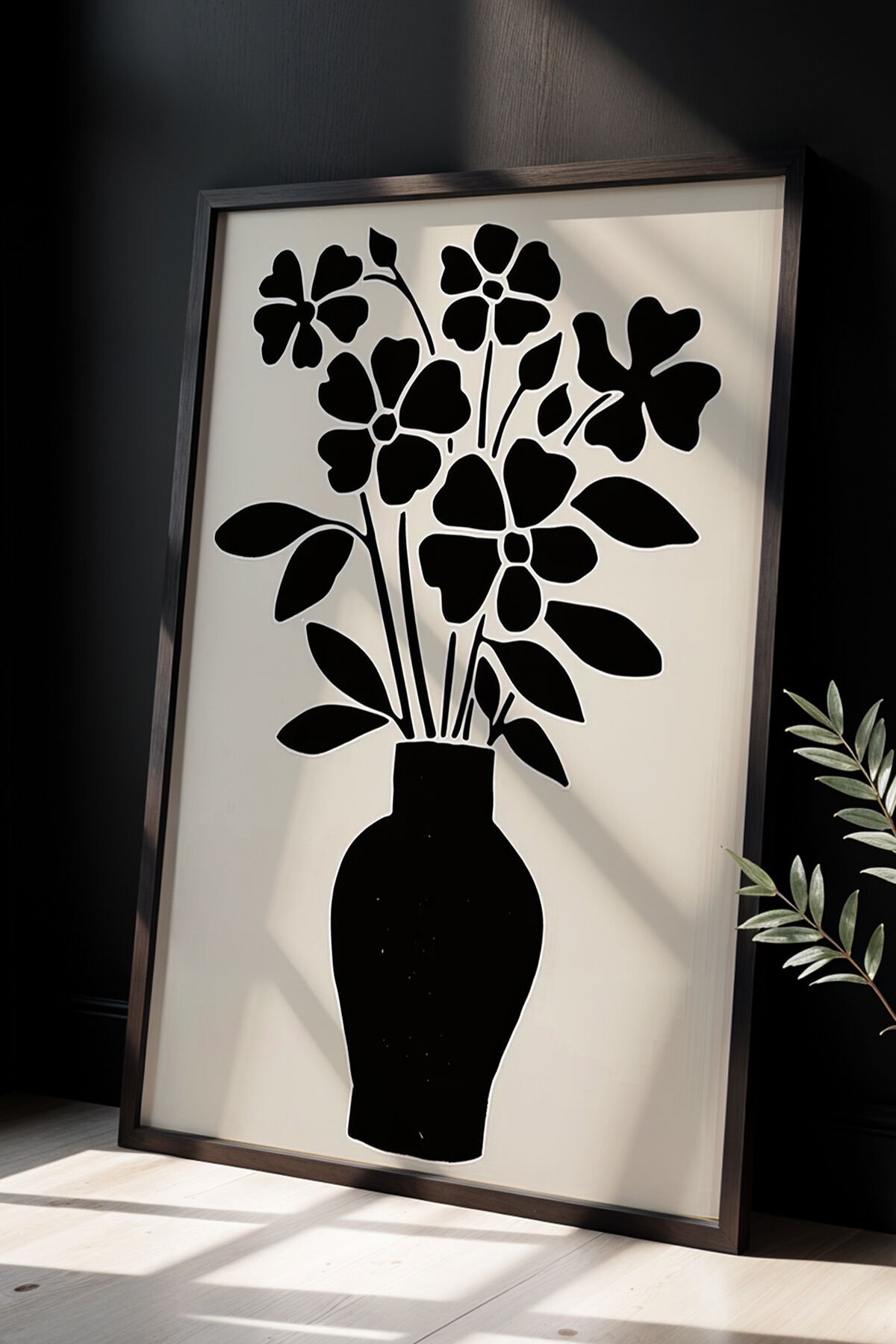 SİYAH - Çiçek Vazosu Siyah Beyaz Baskı Sanatı Ahşap Çerçeveli Duvar Tablosu