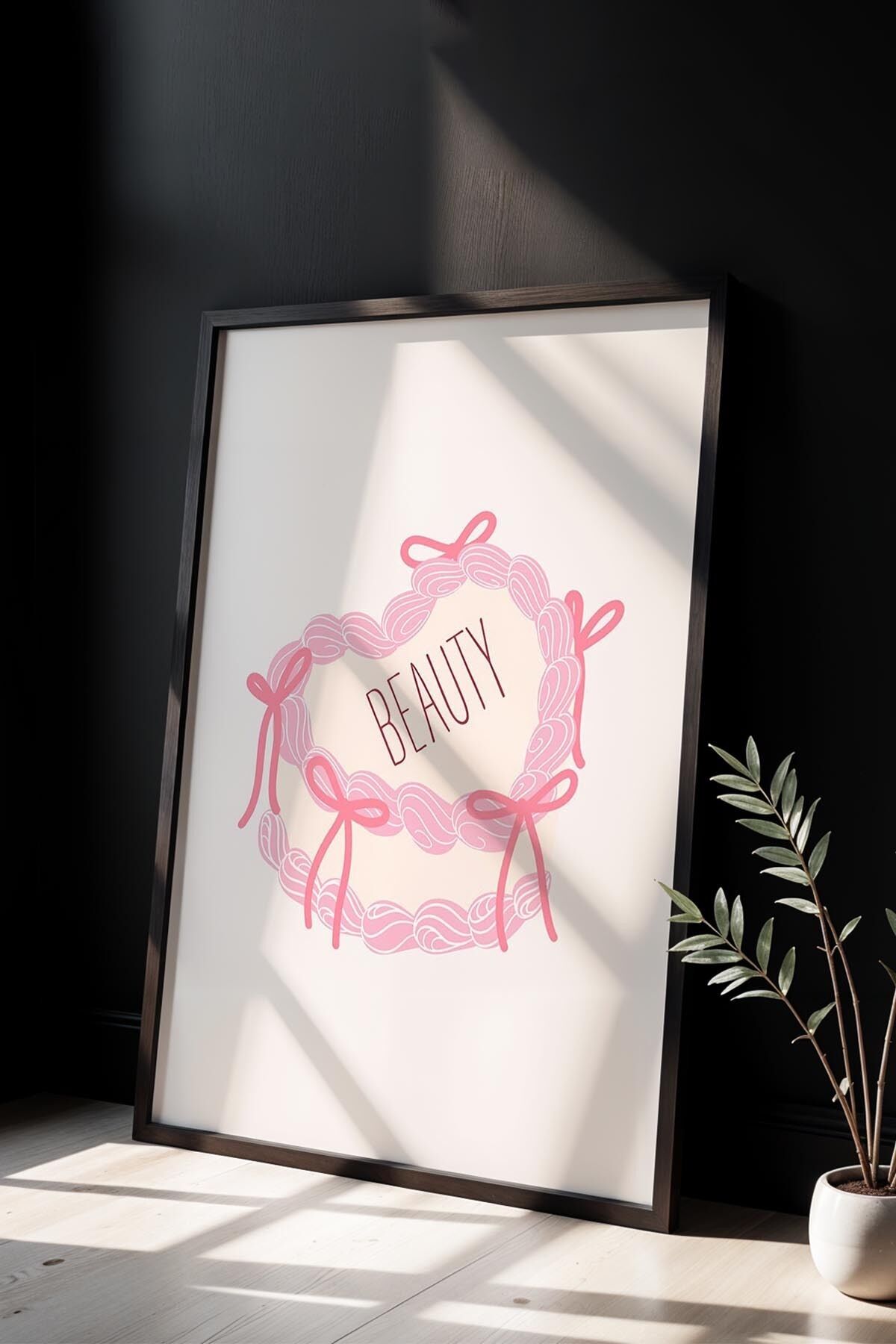 SİYAH - Çiçekli Kurdele Deseni Pembe Maksimalist Sanatı Ahşap Çerçeveli Duvar Tablosu
