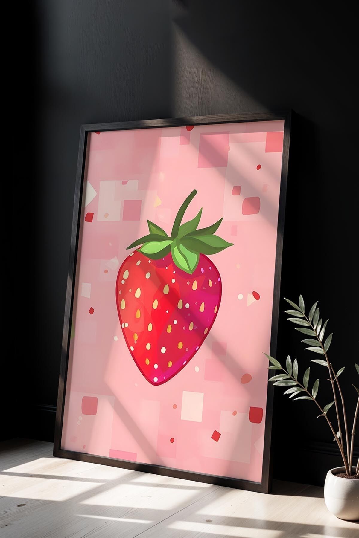 SİYAH - Çilek Deseni Pembe Maksimalist Sanatı Ahşap Çerçeveli Duvar Tablosu