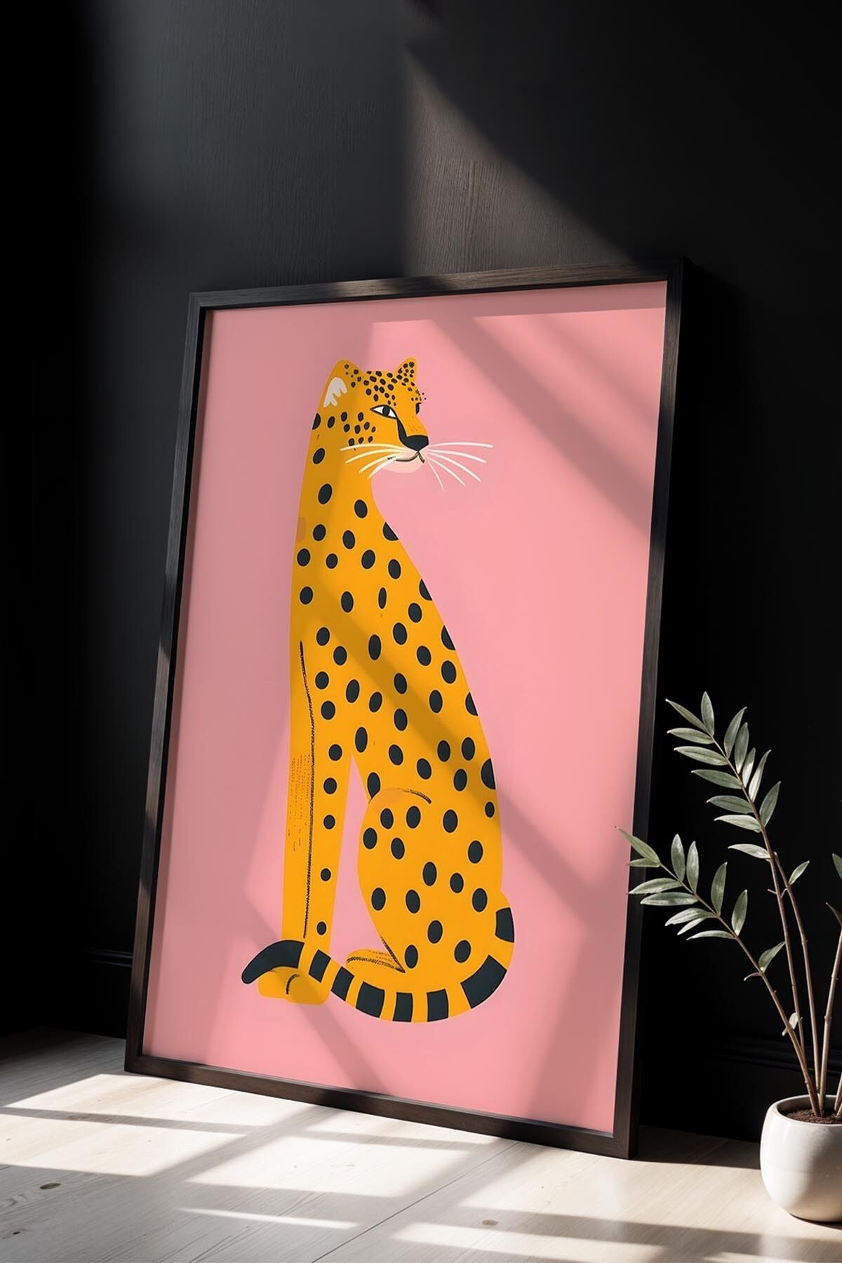 SİYAH - Çita Deseni Sarı Pembe Trendy Maksimalist Sanatı Ahşap Çerçeveli Duvar Tablosu