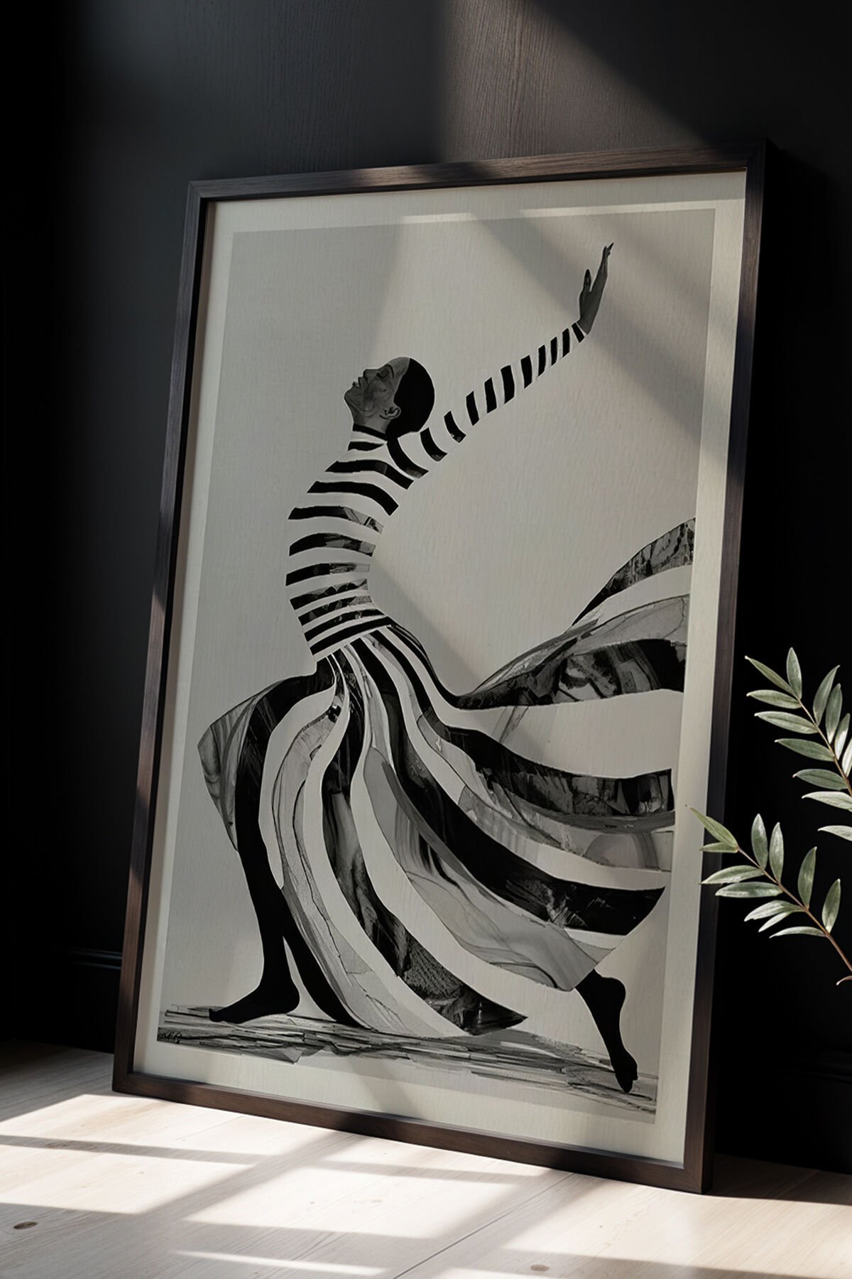 SİYAH - Dans Eden Soyut kadın, Minimalist Siyah Beyaz Sanat Ahşap Çerçeveli Duvar Tablosu