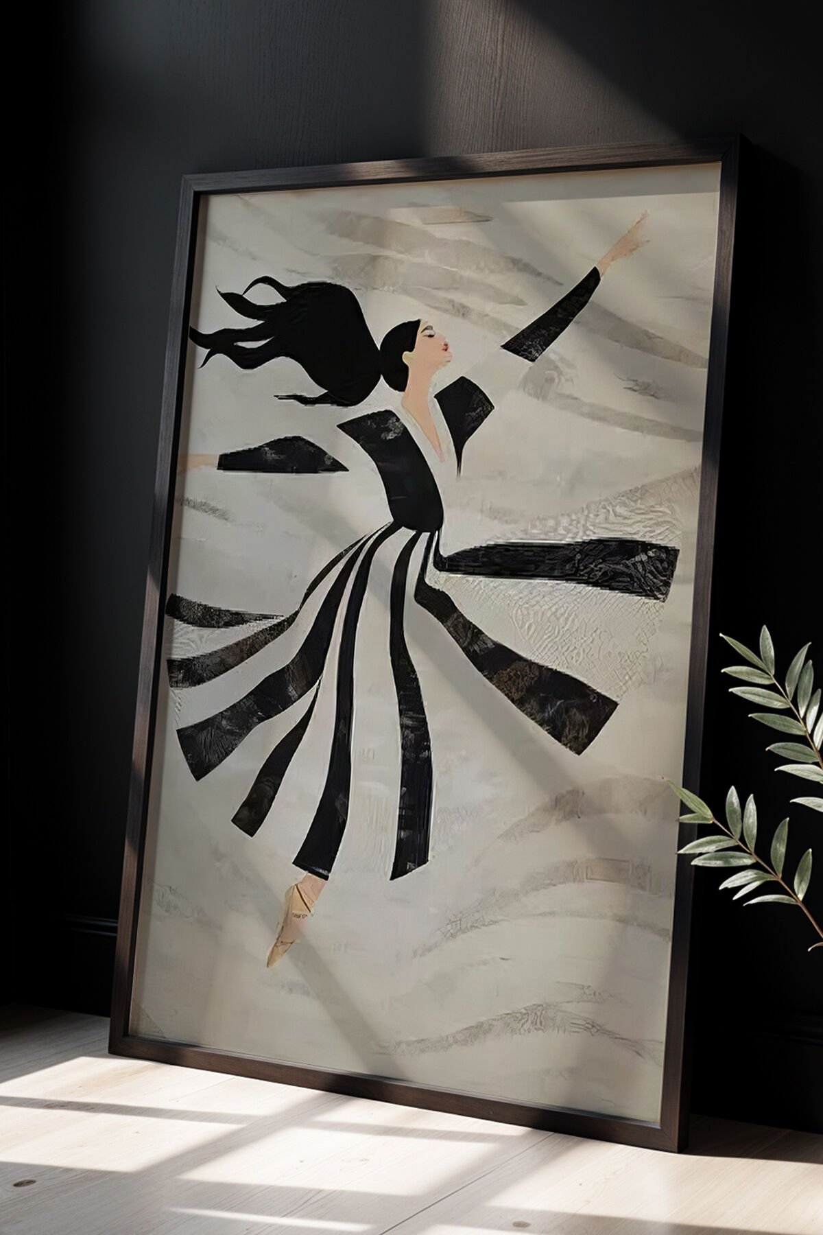 SİYAH - Dans Eden Soyut kadın, Minimalist Siyah Beyaz Sanat Ahşap Çerçeveli Duvar Tablosu