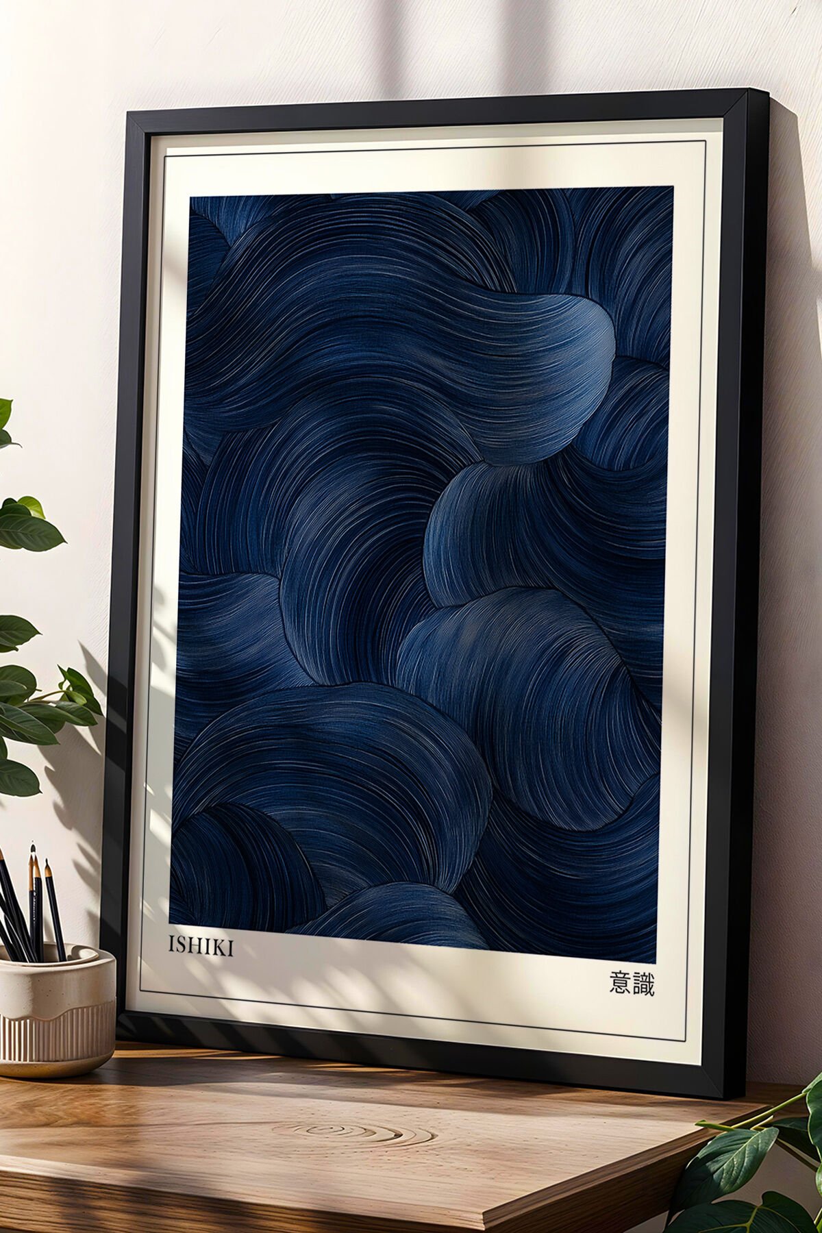 SİYAH - Derin Mavi Soyut Fırça Dokulu Japon Sanatı Doğal Ahşap Duvar Tablosu