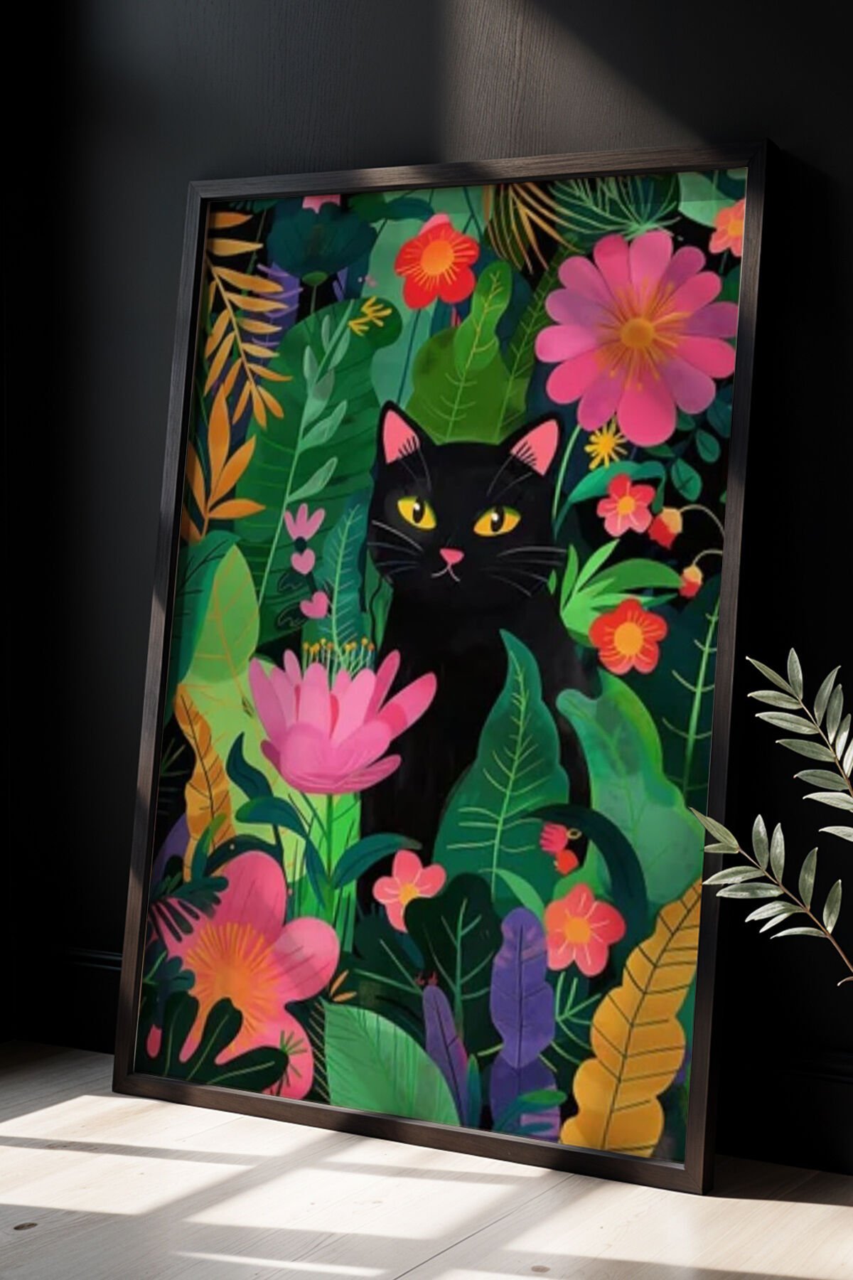 SİYAH - Doğal ahşap çerçeveli Çiçekli Kedi Botanik Sanat Baskısı Duvar Tablosu