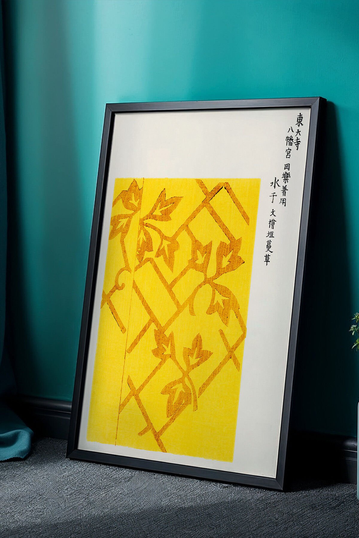 SİYAH - Doğal Ahşap Çerçeveli Japandi Sarı Yaprak Desenli Tablo
