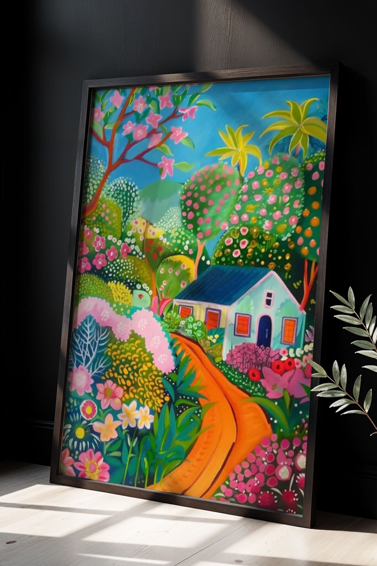 SİYAH - Doğal Ahşap Çerçeveli Soyut Çiçek Bahçesi Renkli Manzara Duvar tablosu