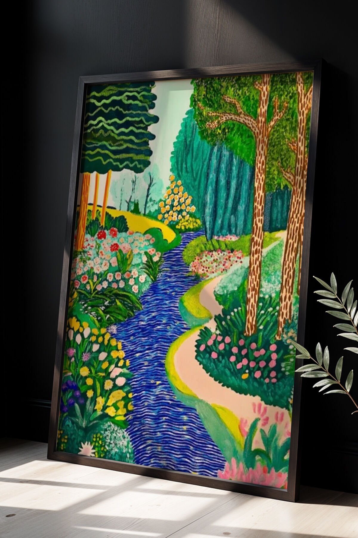 SİYAH - Doğal Ahşap Çerçeveli Soyut Çiçek Bahçesi Renkli Manzara Duvar tablosu