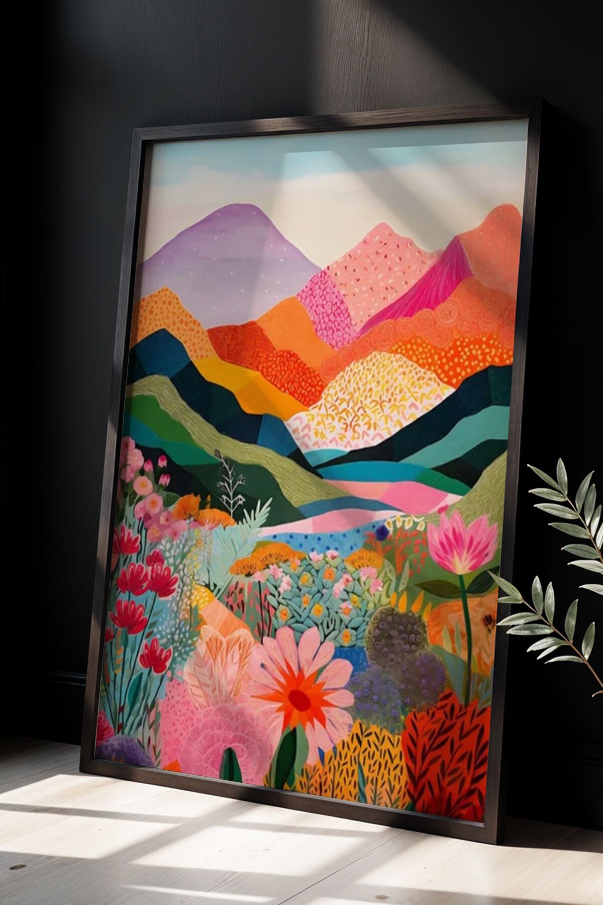 SİYAH - Doğal Ahşap çerçeveli Soyut Dağ Sanat Eseri, Renkli manzara salon Duvar tablosu