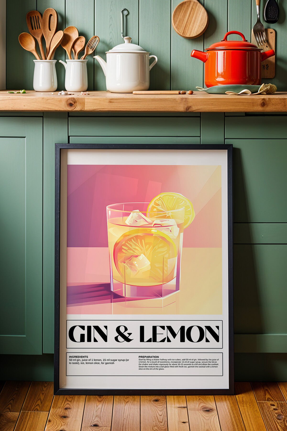 SİYAH - Gin & Limon Kokteyl Mutfak Ahşap Çerçeveli Duvar Tablosu