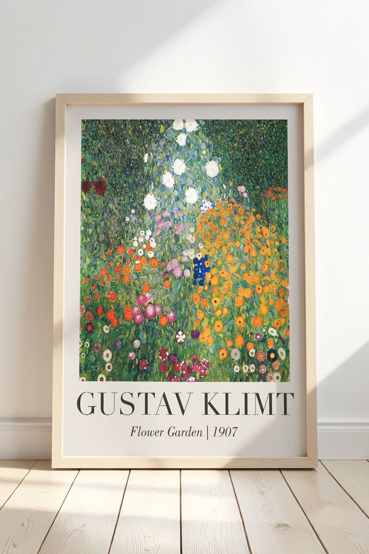 SİYAH - Gustav Klimt Çiçek Bahçesi 1907 Vintage Doğal Ahşap Çerçeveli Duvar Tablosu