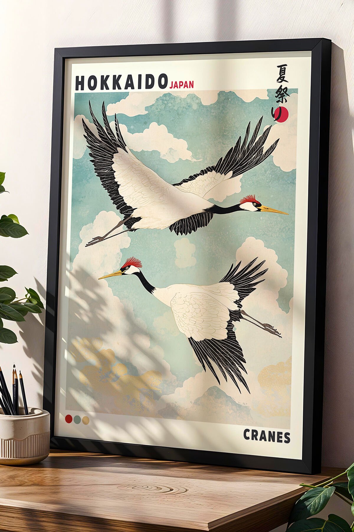 SİYAH - Hokkaido Kırmızı Taçlı Turnalar Japon Duvar Sanatı Vintage Doğal Ahşap Çerçeveli Tablo